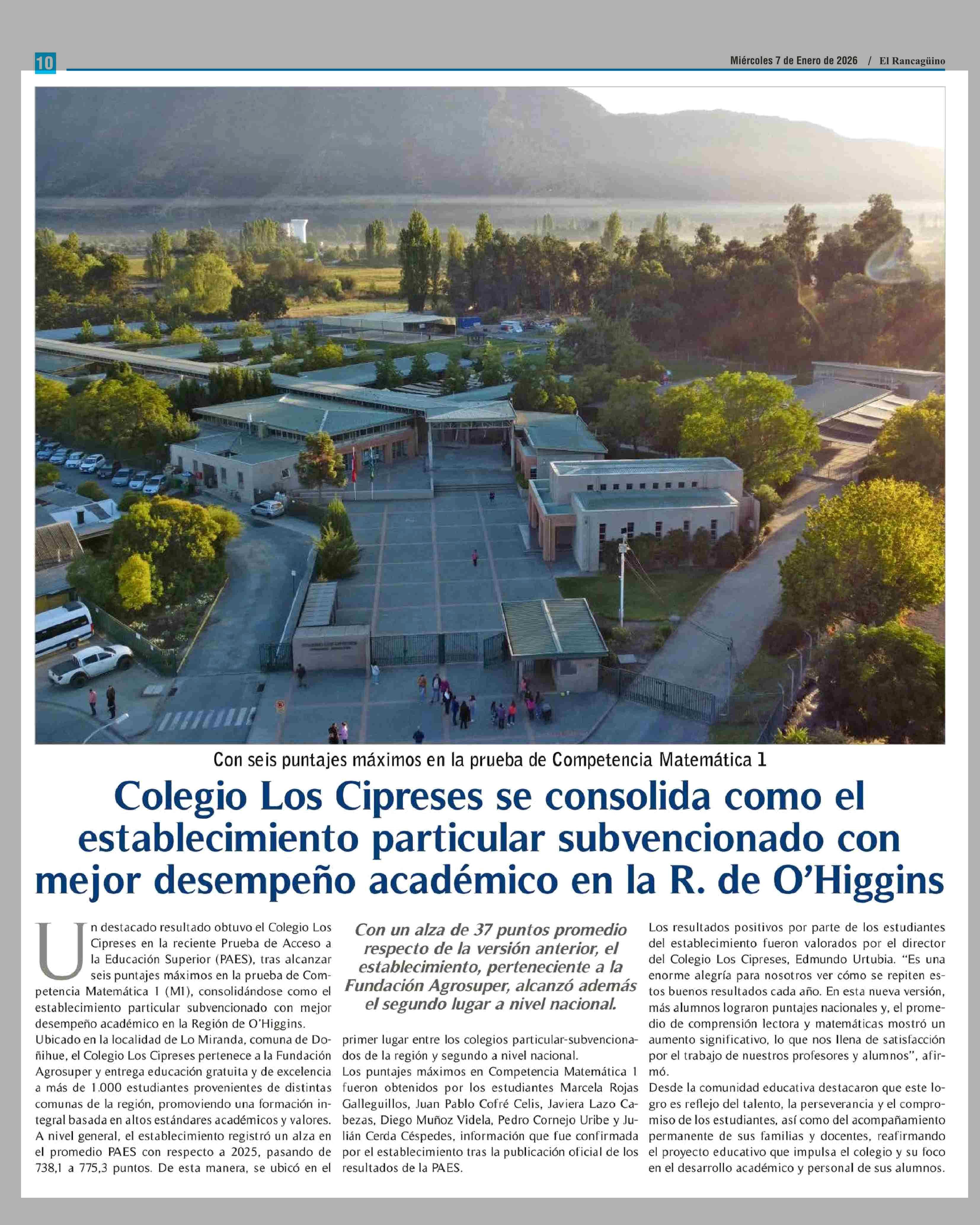 Título: Colegio Los Cipreses se consolida como el establecimiento particular subvencionado con mejor desempeño académico en la R. de O'Higgins