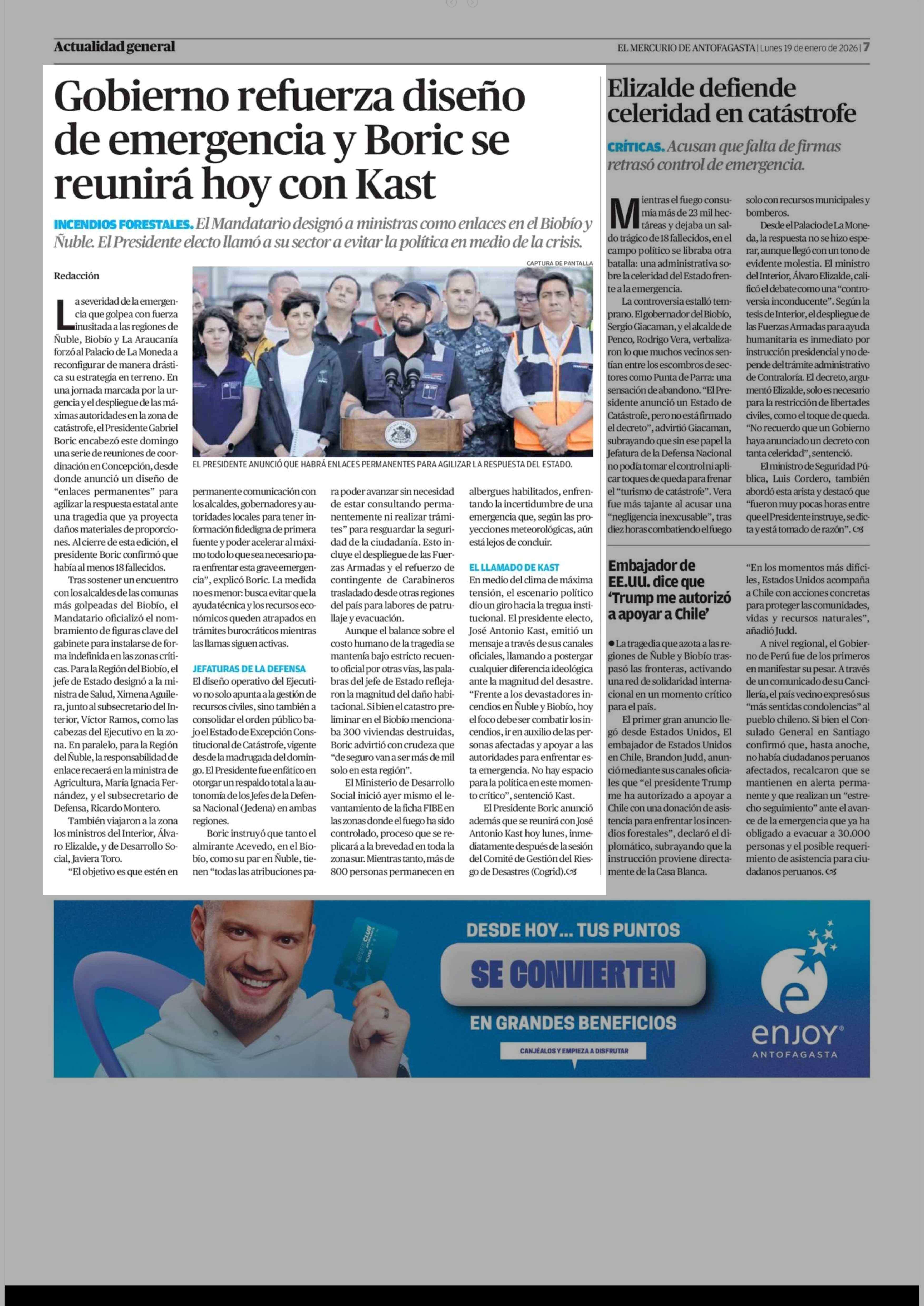Gobierno refuerza diseño de emergencia y Boric se reunirá hoy con Kast 19-01-2026 El Mercurio de Antofagasta |