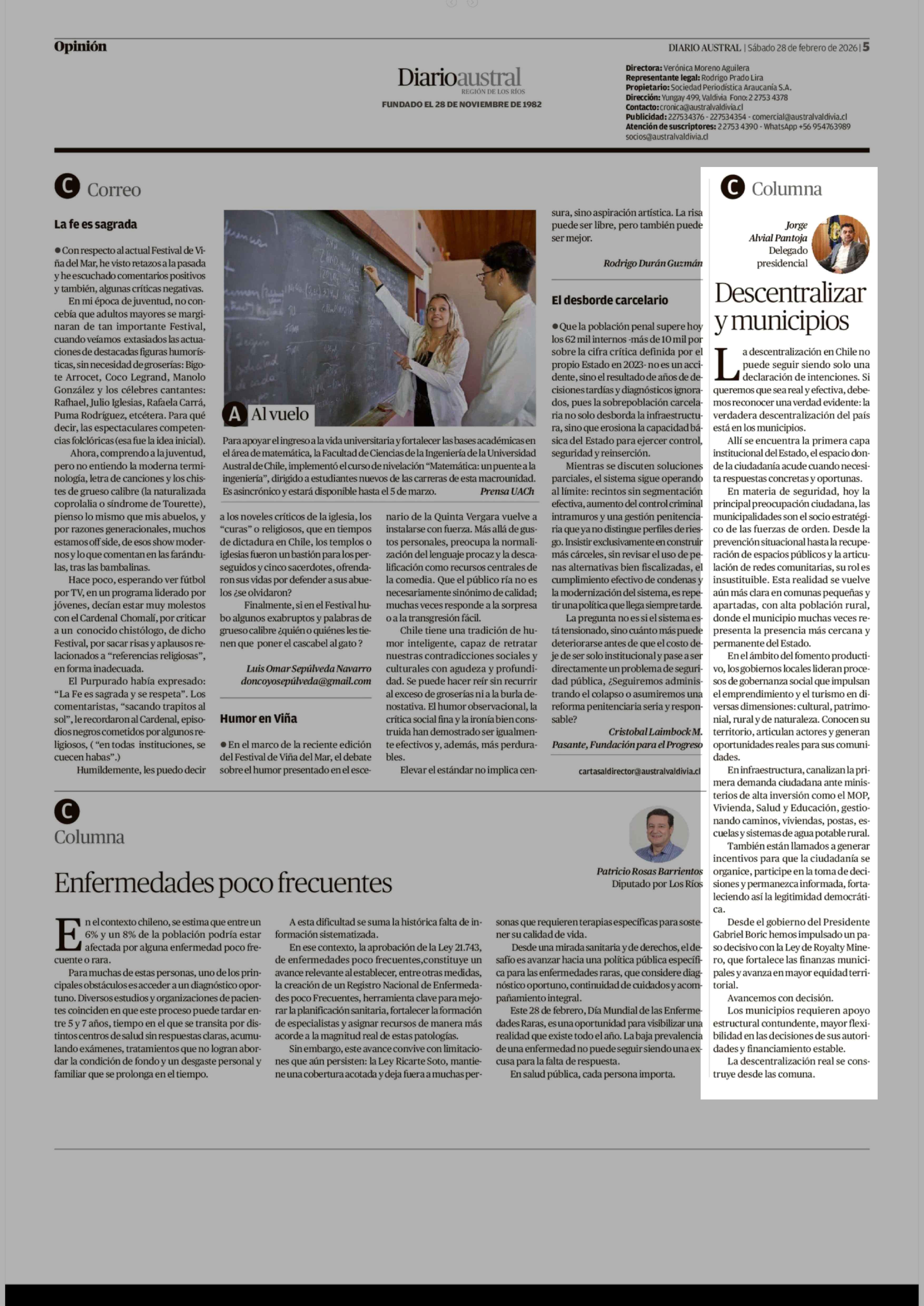 Columnas de Opinión: Descentralizar y municipios 28-02-2026 Diario Austral Región de Los Ríos |