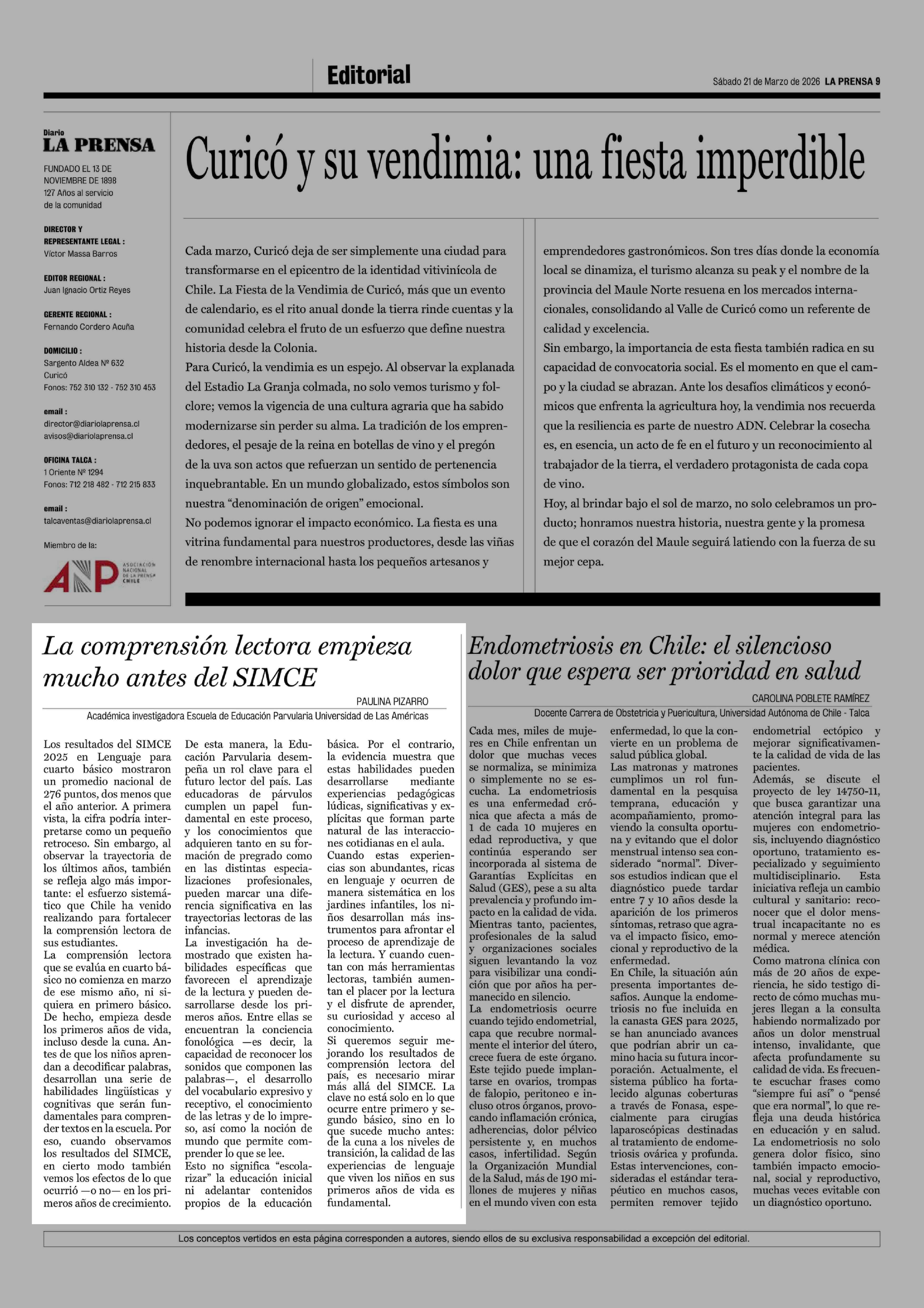 Cartas: La comprensión lectora empieza mucho antes del SIMCE 21-03-2026 La Prensa de Curicó |