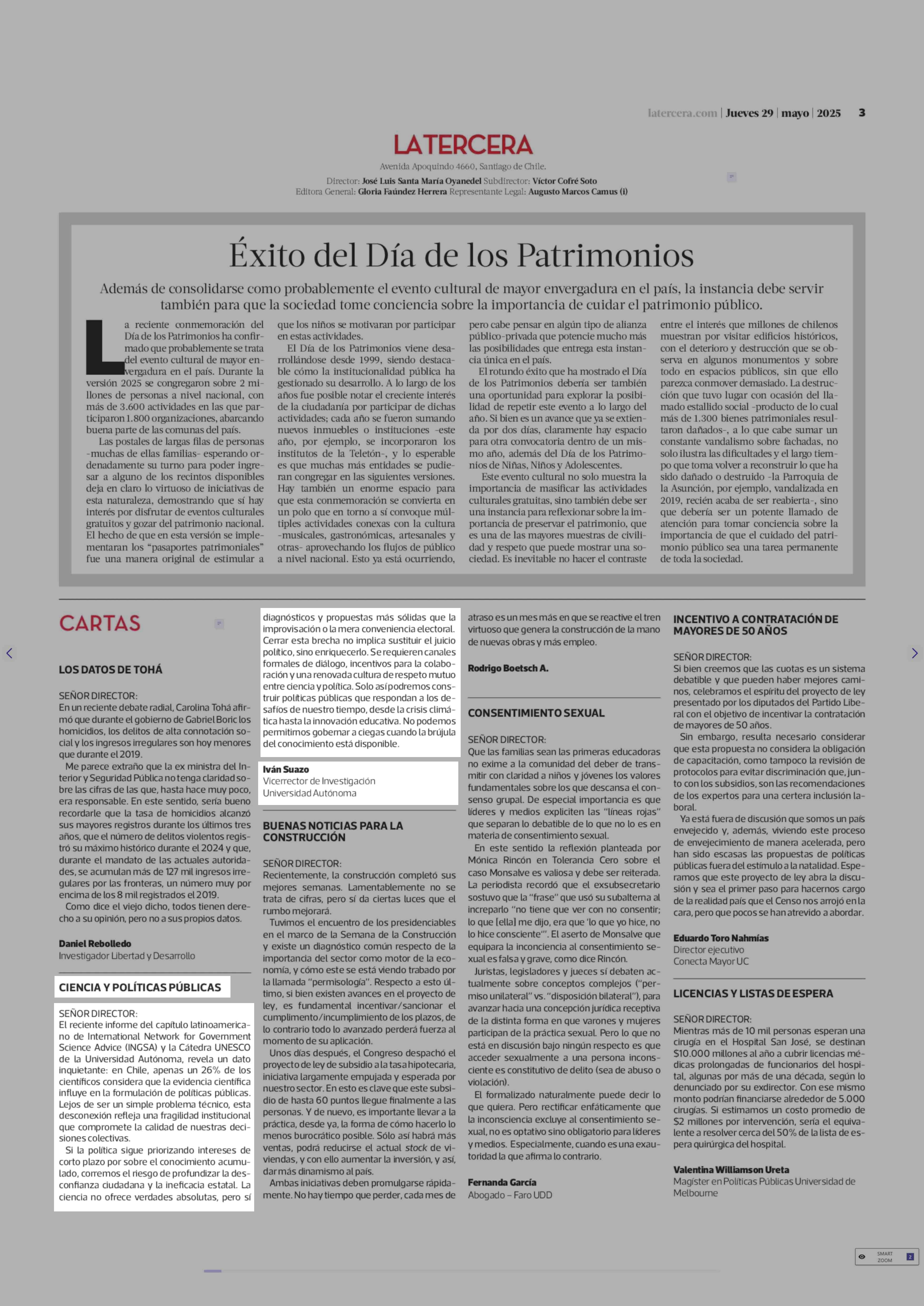 CARTAS: CIENCIA Y POLÍTICAS PÚBLICAS 29-05-2025 La Tercera |