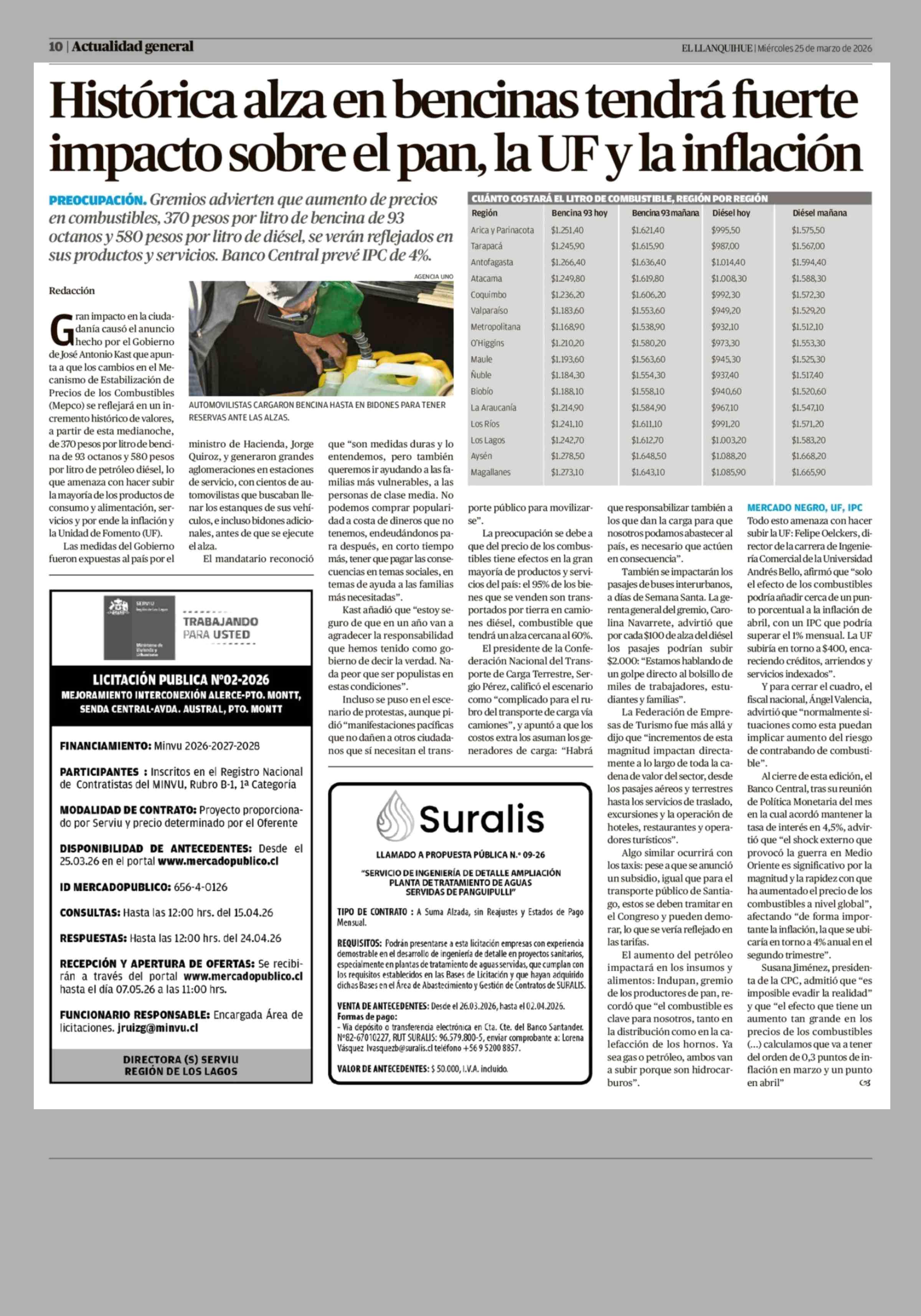 Histórica alza en bencinas tendrá fuerte impacto sobre el pan, la UF y la inflación 25-03-2026 El Llanquihue |