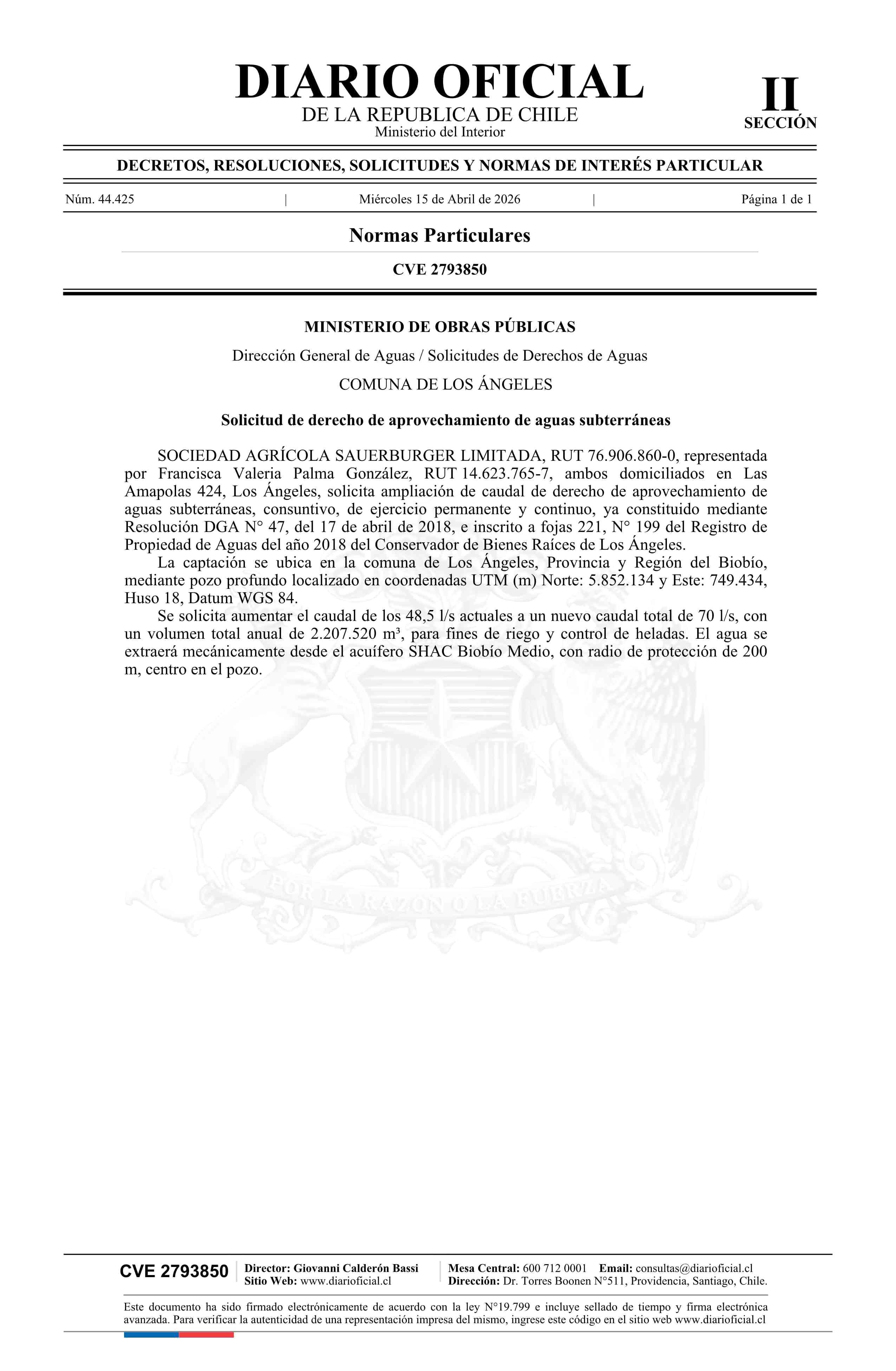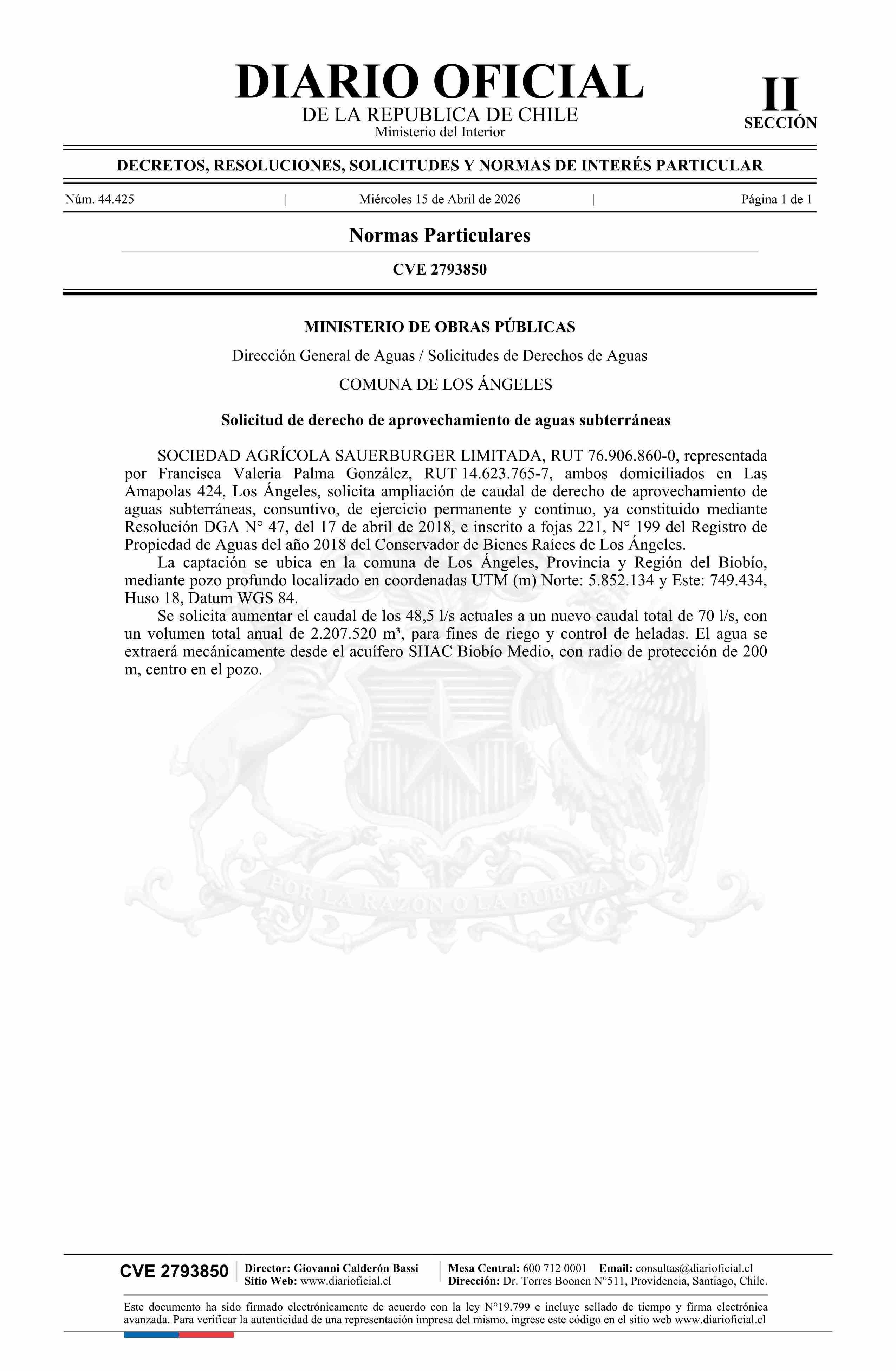 Solicitud Sociedad Agrícola Sauerburger Limitada 15-04-2026 Diario Oficial Edición Electrónica |