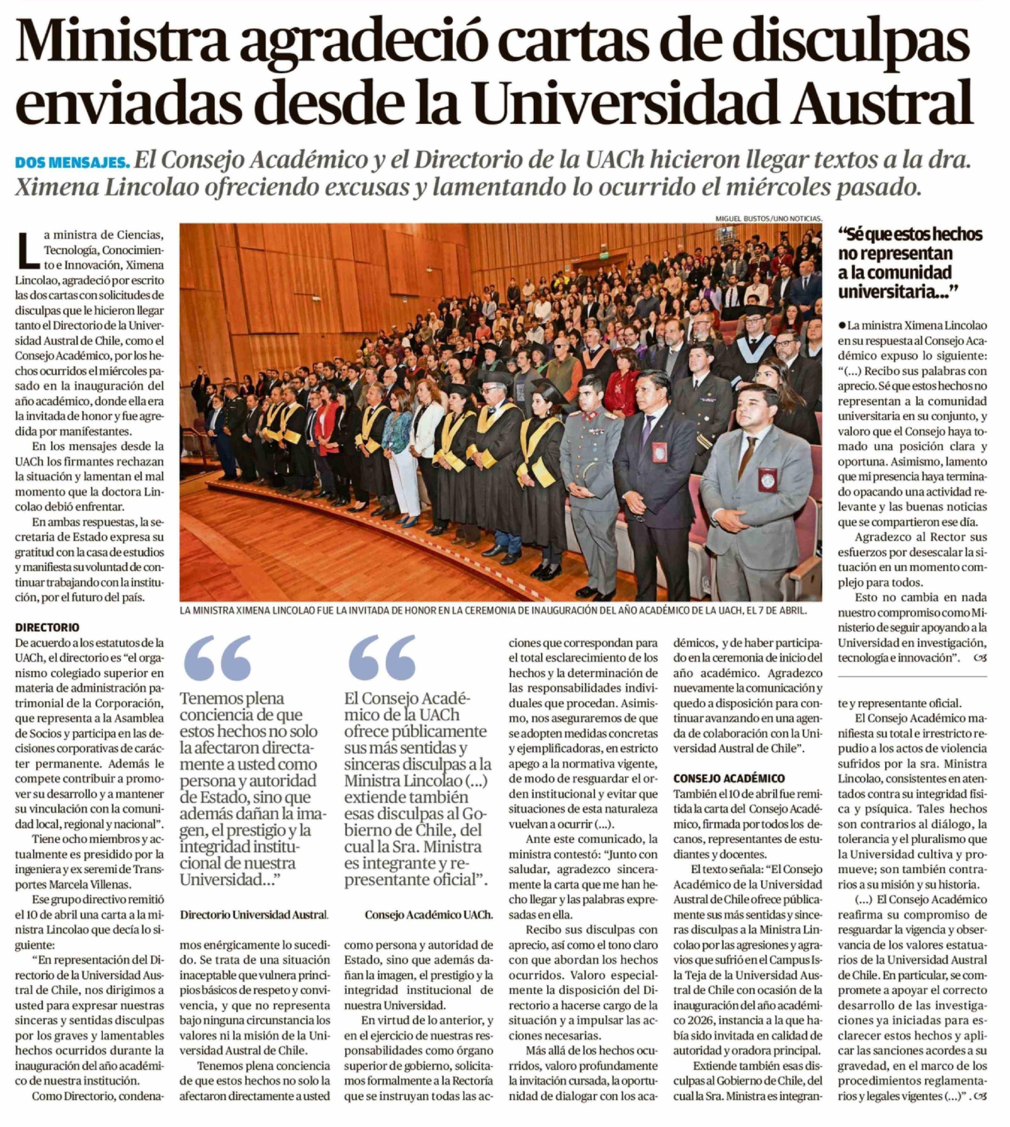 Ministra agradeció cartas de disculpas enviadas desde la Universidad Austral 12-04-2026 Diario Austral Región de Los Ríos |