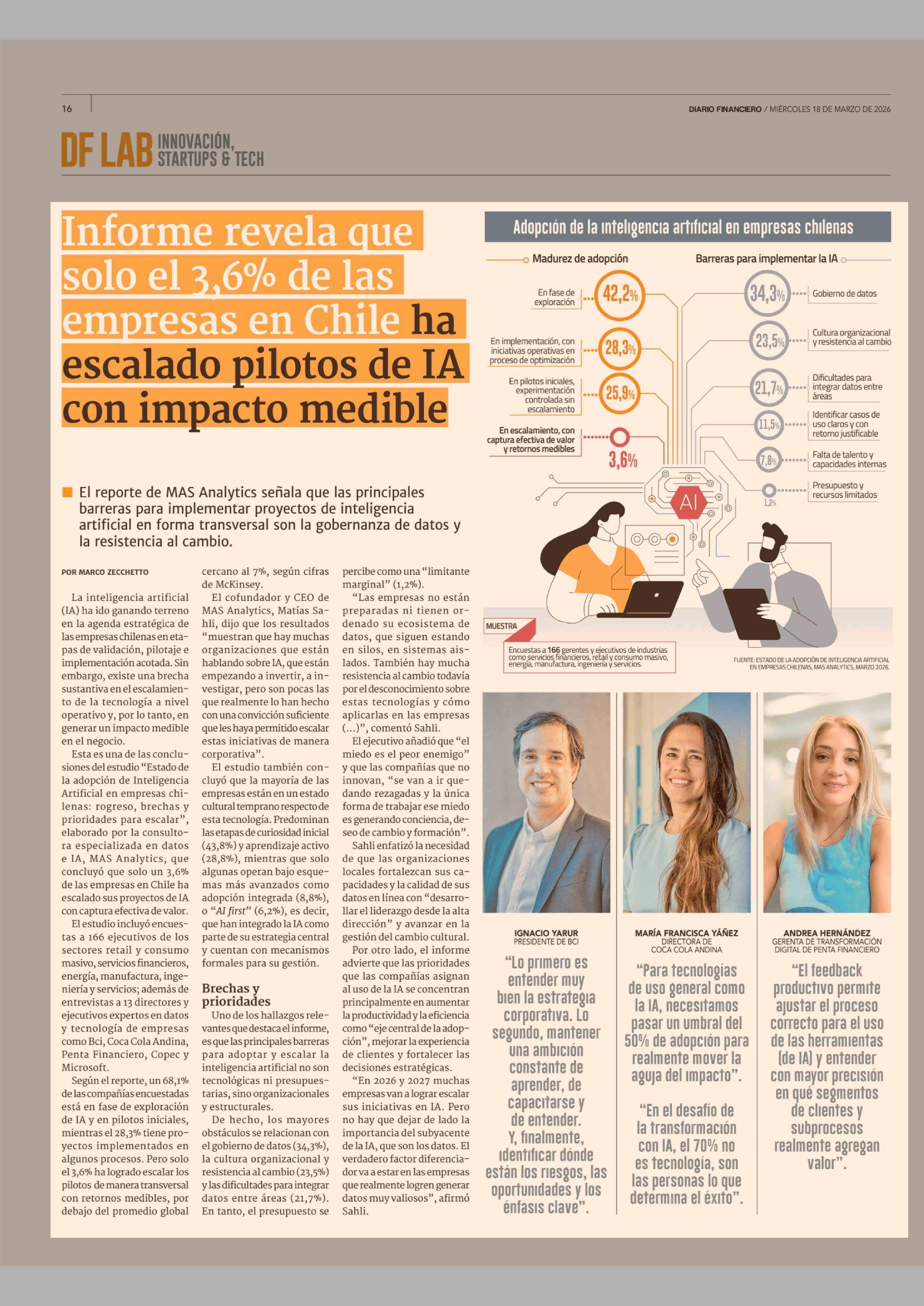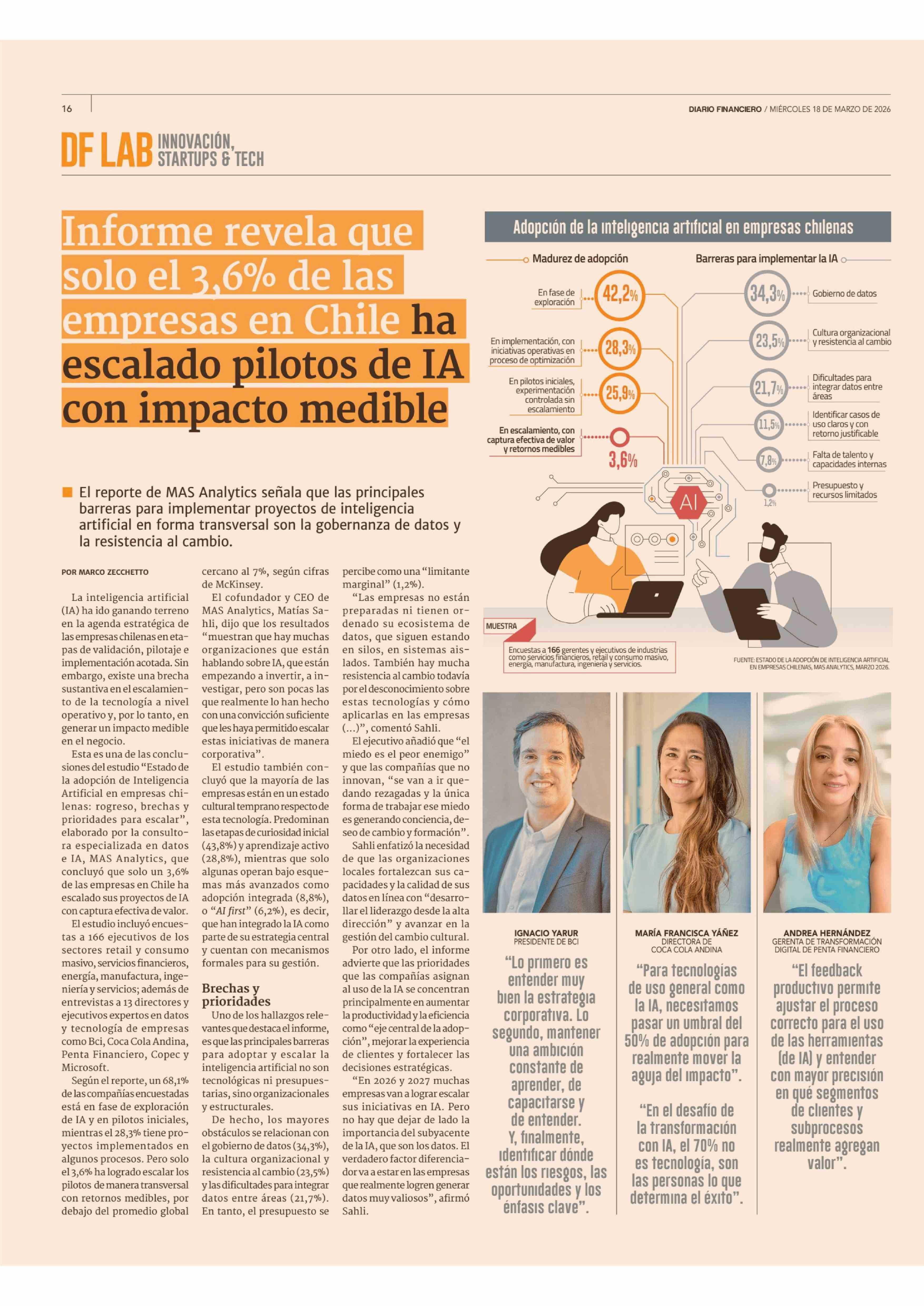 Informe revela que solo el 3,6% de las empresas en Chile ha escalado pilotos de IA con impacto medible 18-03-2026 Diario Financiero |