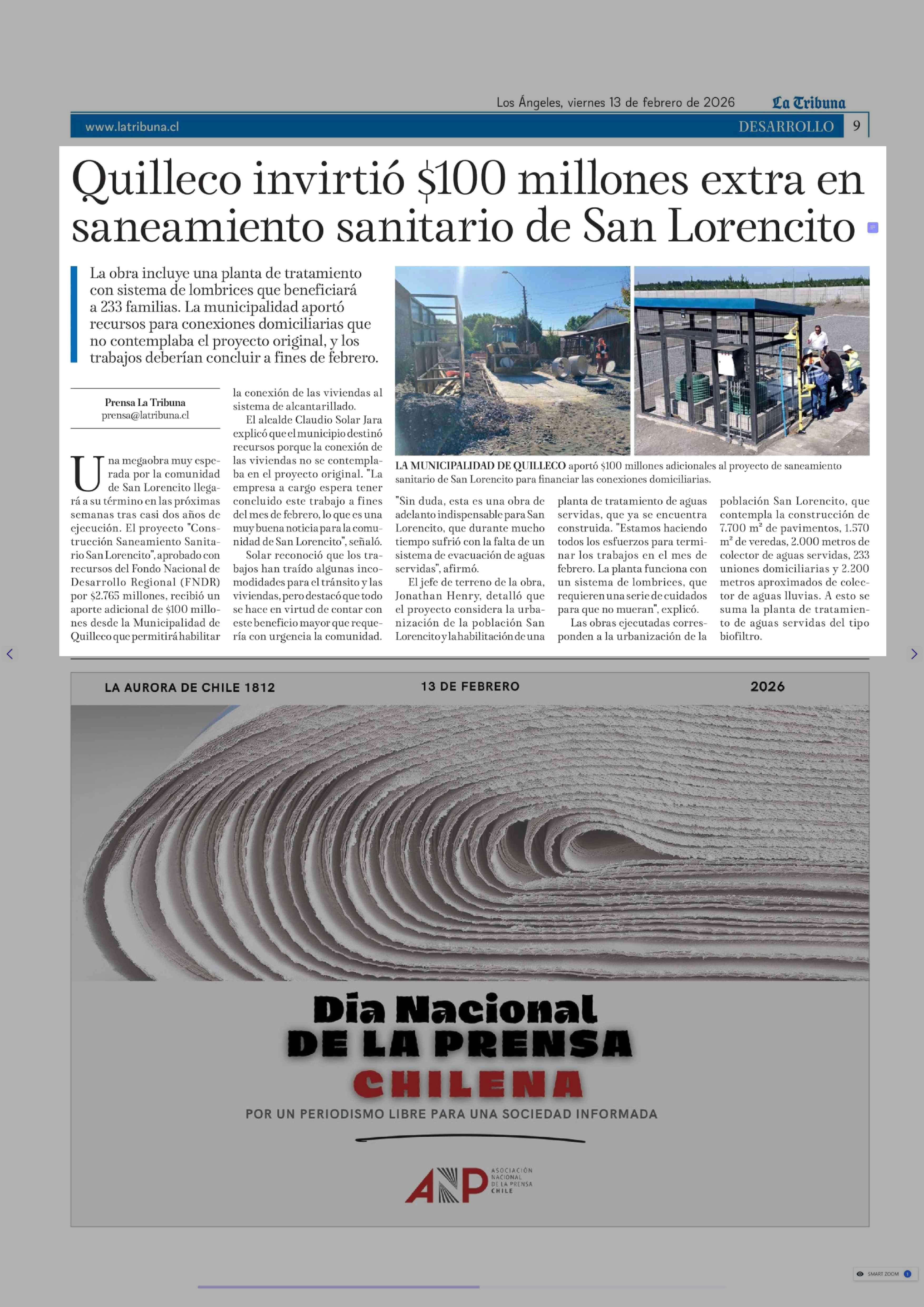Quilleco invirtió $100 millones extra en saneamiento sanitario de San Lorencito 13-02-2026 La Tribuna |
