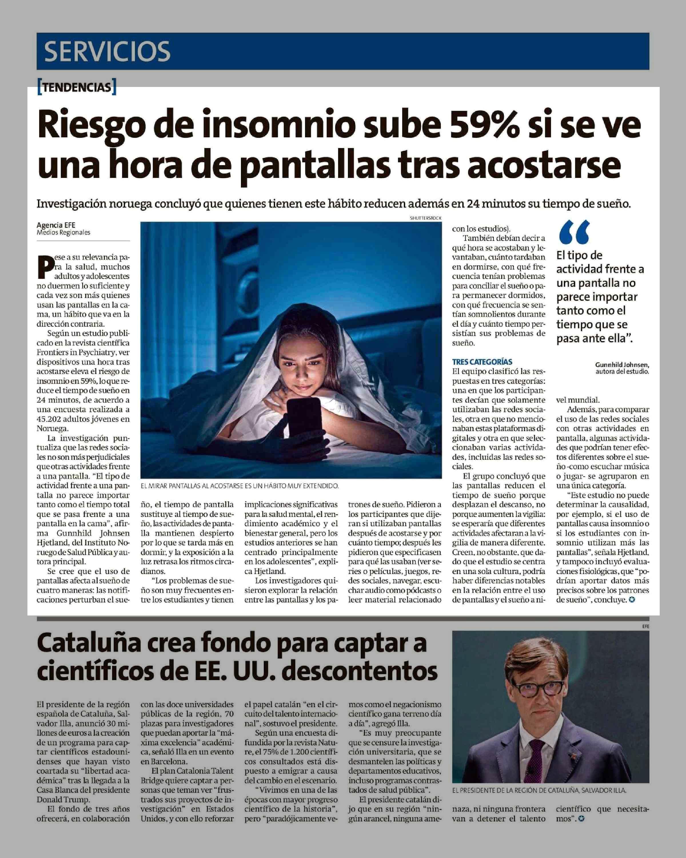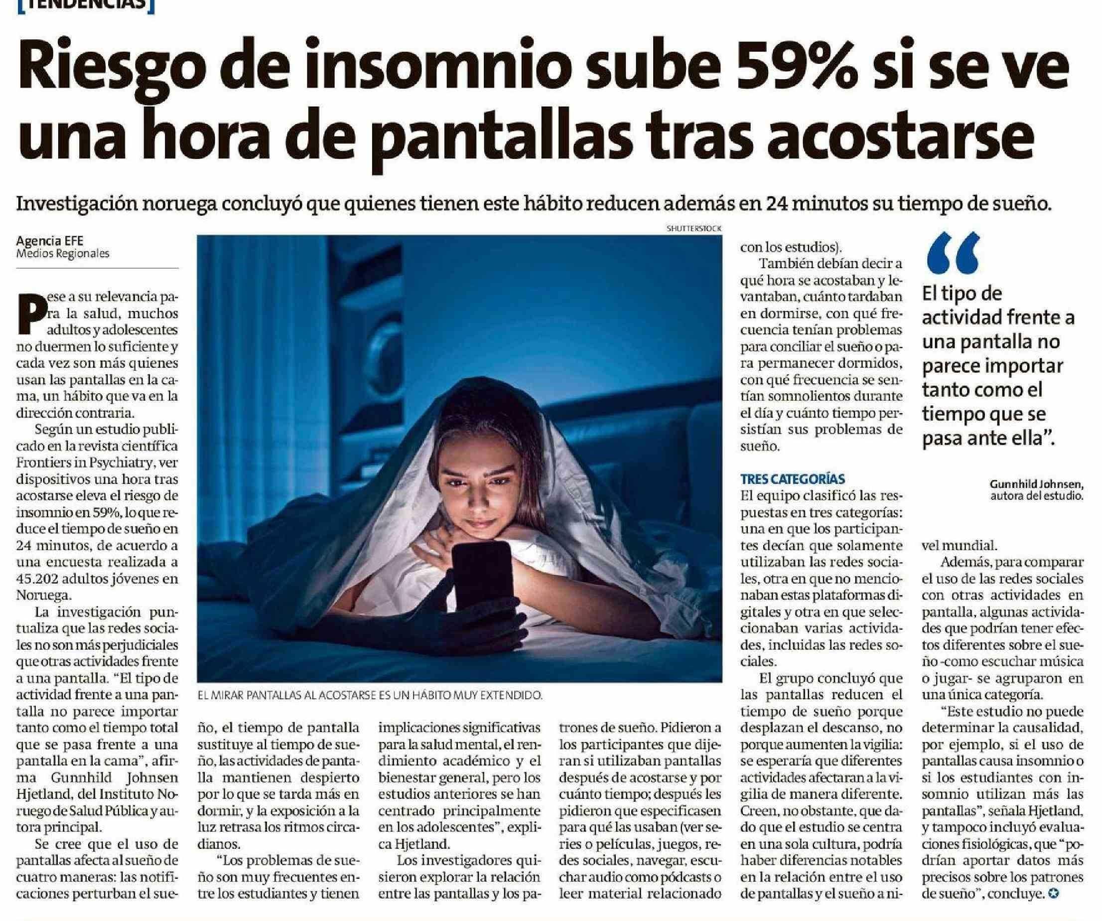 | Título: | Riesgo de insomnio sube 59% si se ve una hora de pantallas tras acostarse |