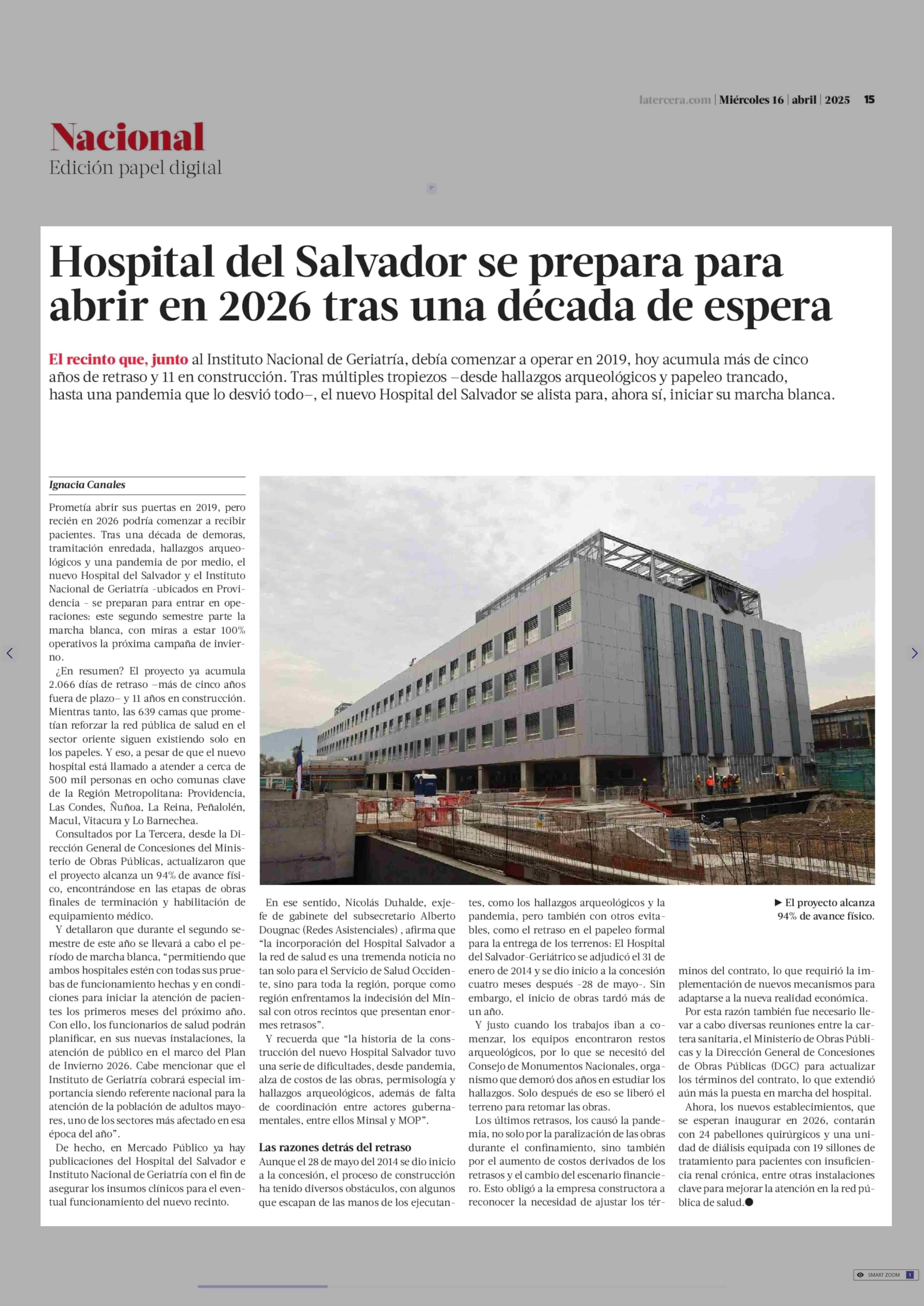 Hospital del Salvador se prepara para abrir en 2026 tras una década de espera 16-04-2025 La Tercera |