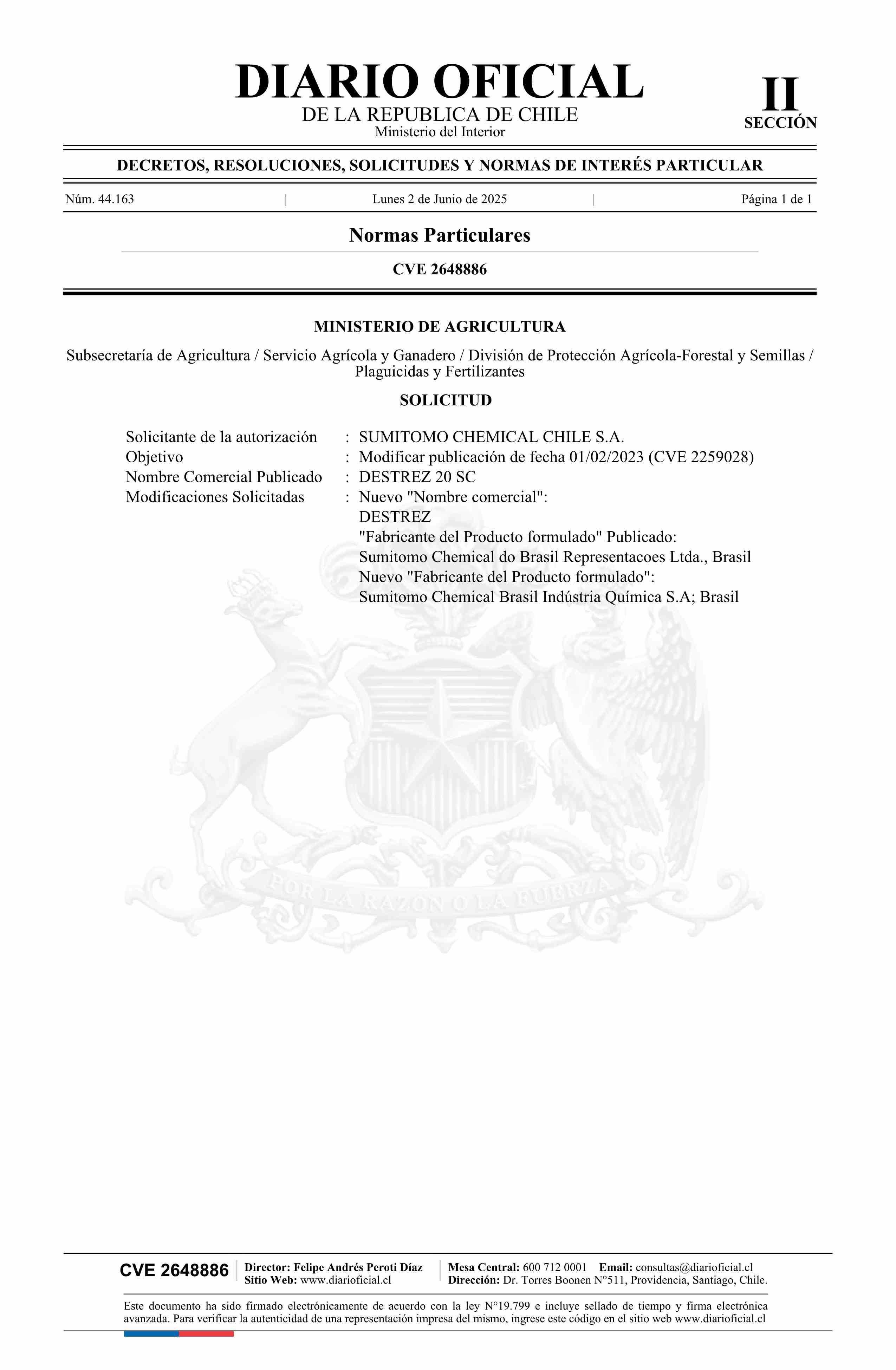 Solicitud Sumitomo Chemical Chile S.A. 02-06-2025 Diario Oficial Edición Electrónica |