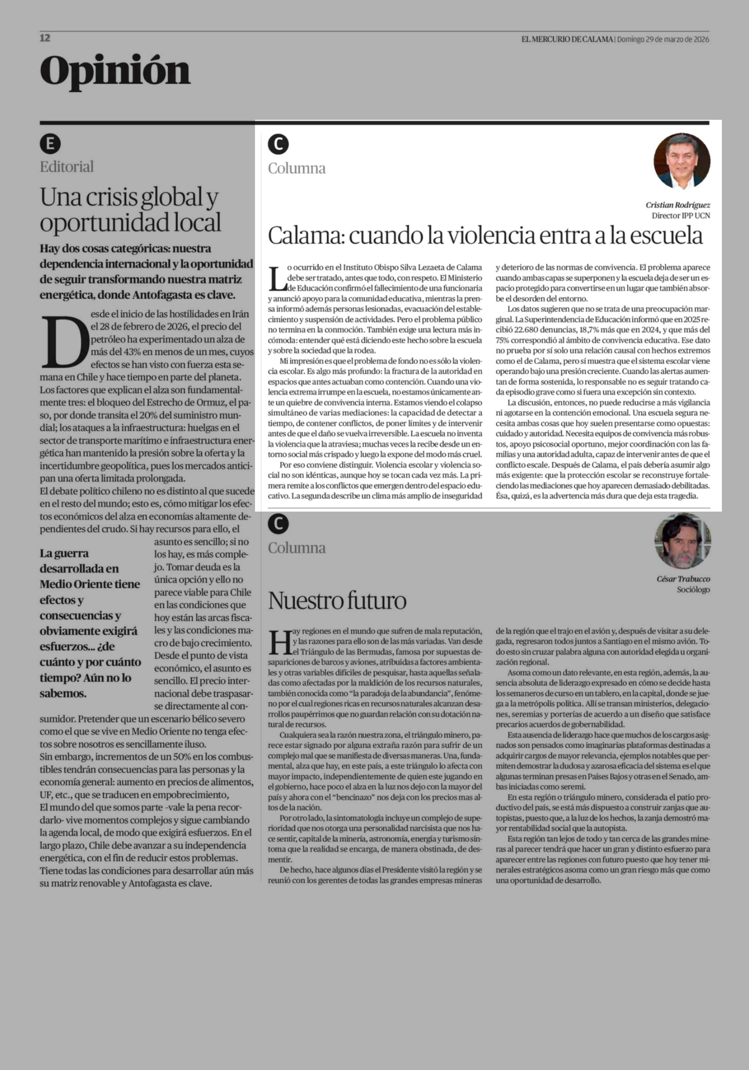 Columnas de Opinión: Calama: cuando la violencia entra a la escuela 29-03-2026 El Mercurio de Calama |
