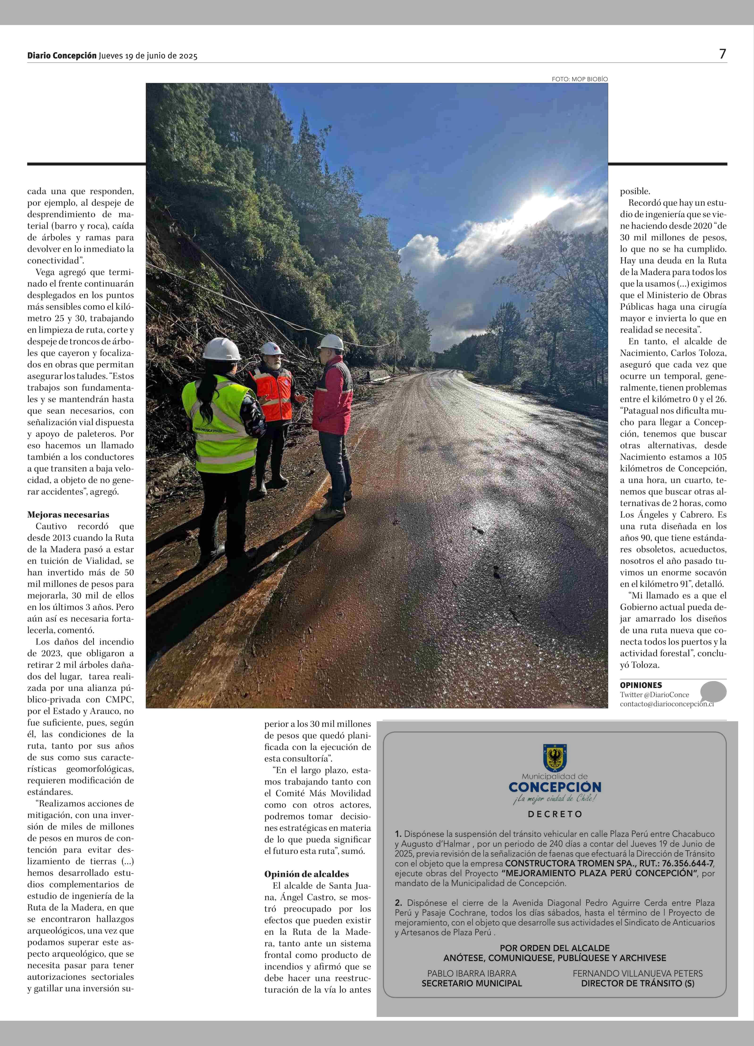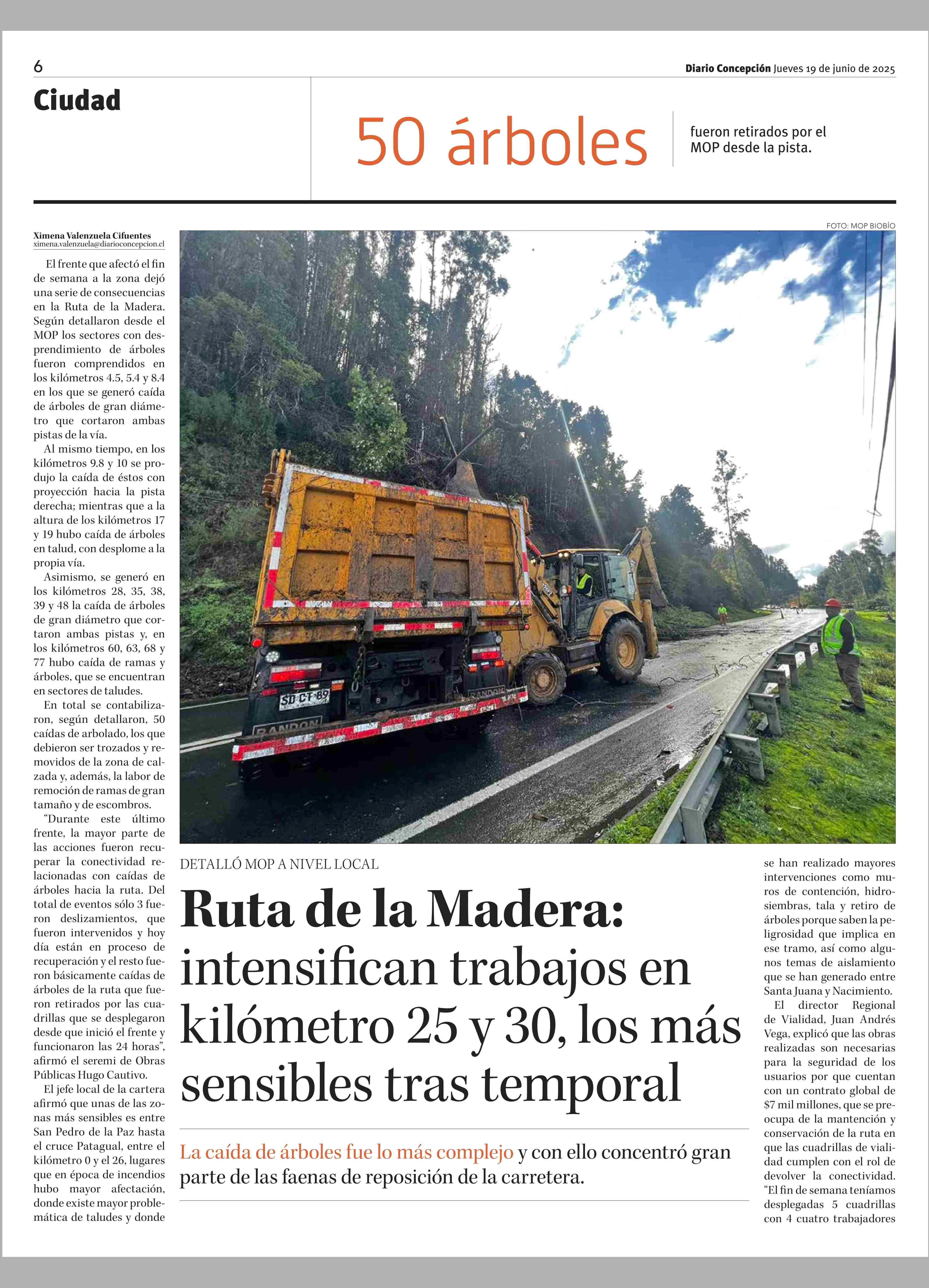 Ruta de la Madera: intensifican trabajos en kilómetro 25 y 30, los más sensibles tras temporal 19-06-2025 Diario Concepción |