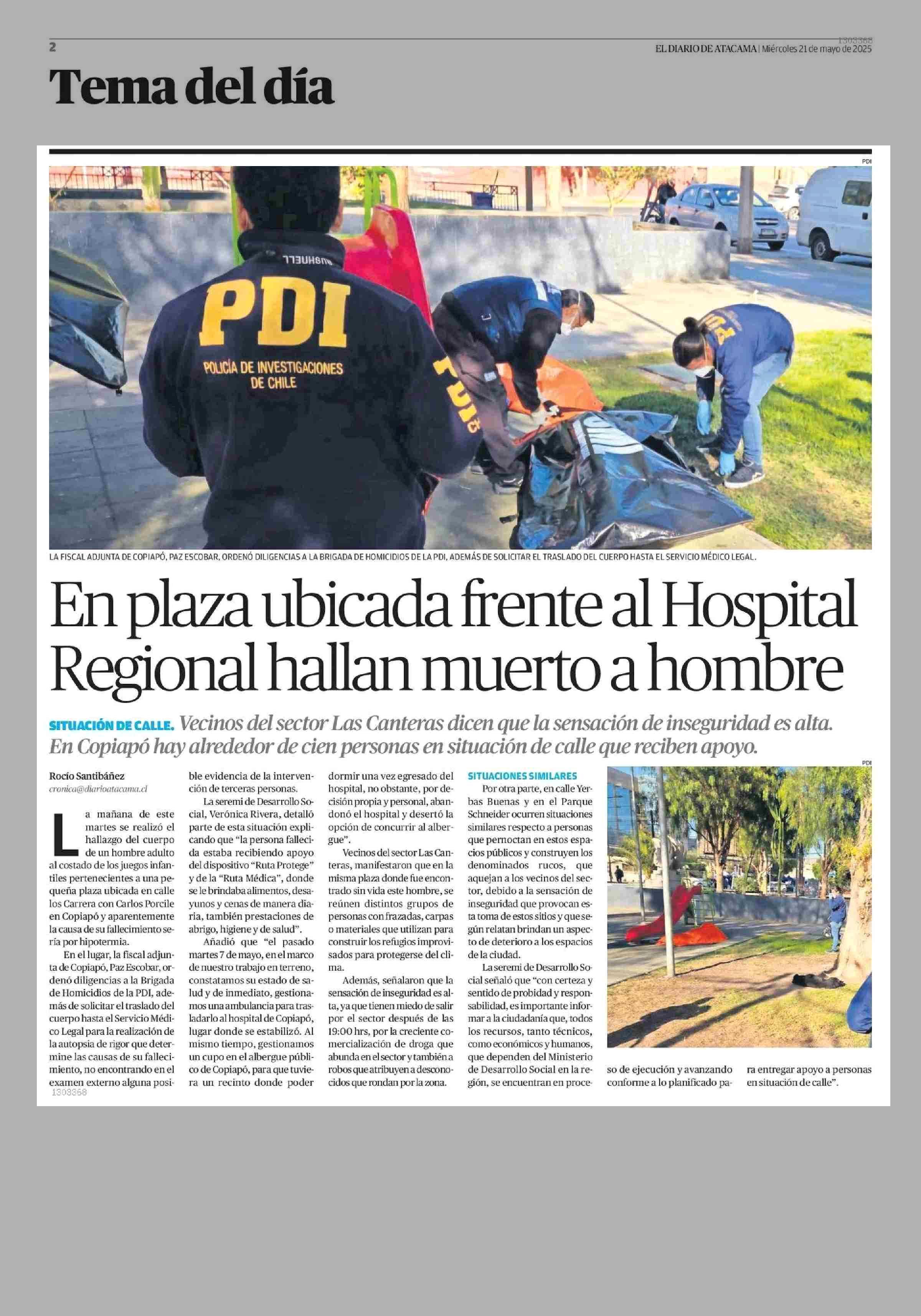 En plaza ubicada ente al Hospital Regjonal hallan muerto a hombre 21-05-2025 El Diario de Atacama |