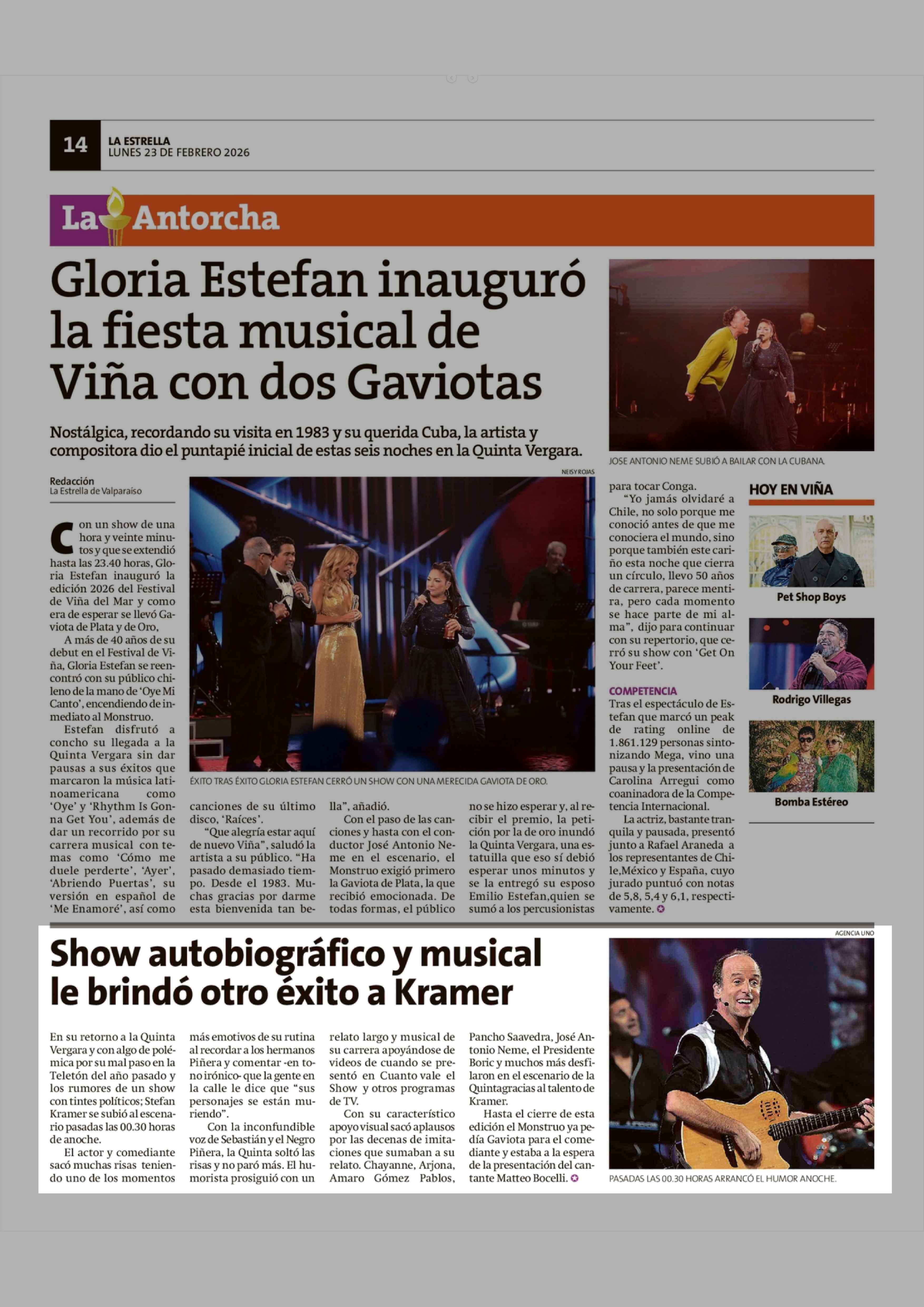 Show autobiográfico y musical le brindó otro éxito a Kramer 23-02-2026 La Estrella de Valparaíso |