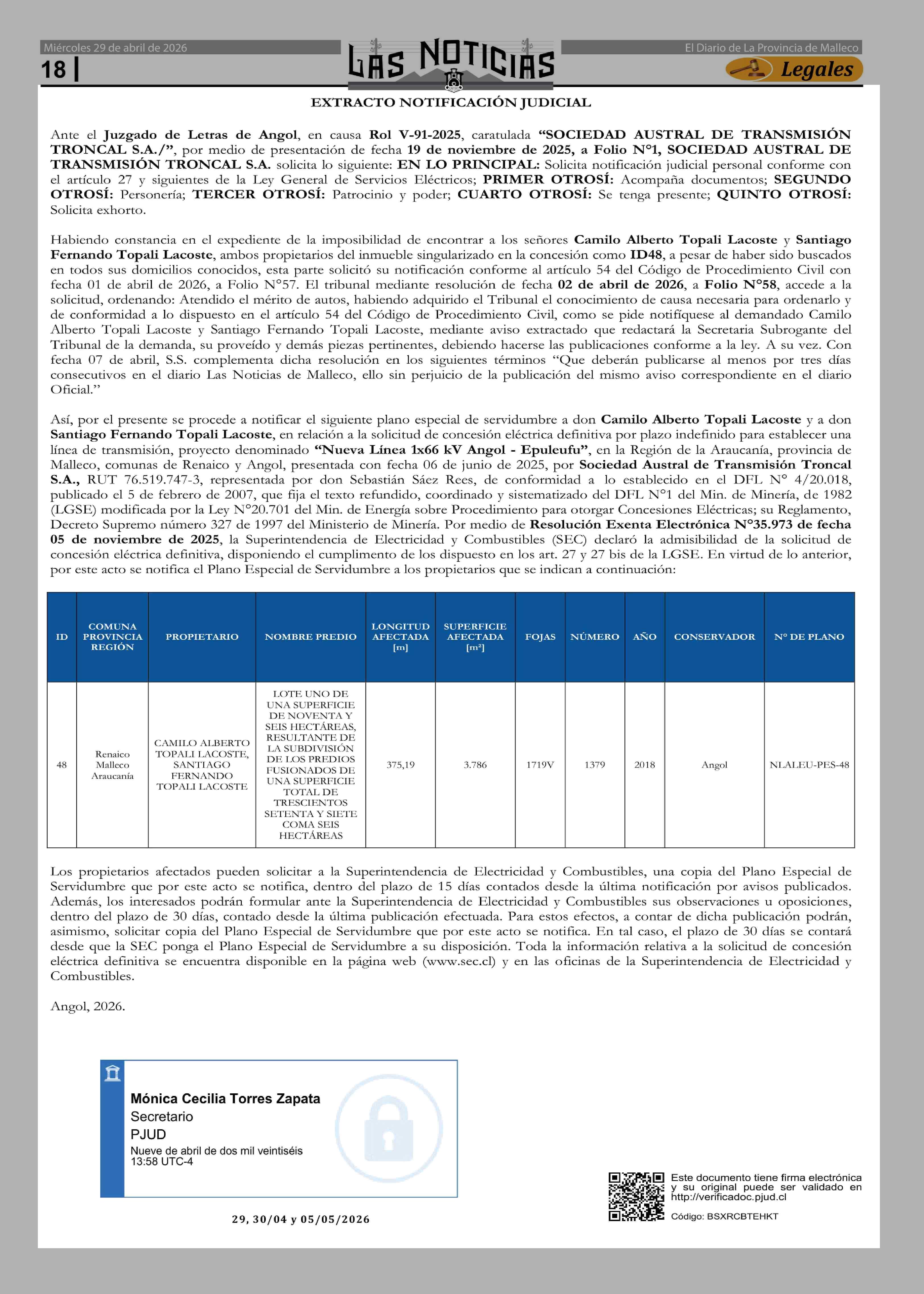 Extractos: EXTRACTO NOTIFICACIÓN JUDICIAL 29-04-2026 Las Noticias |