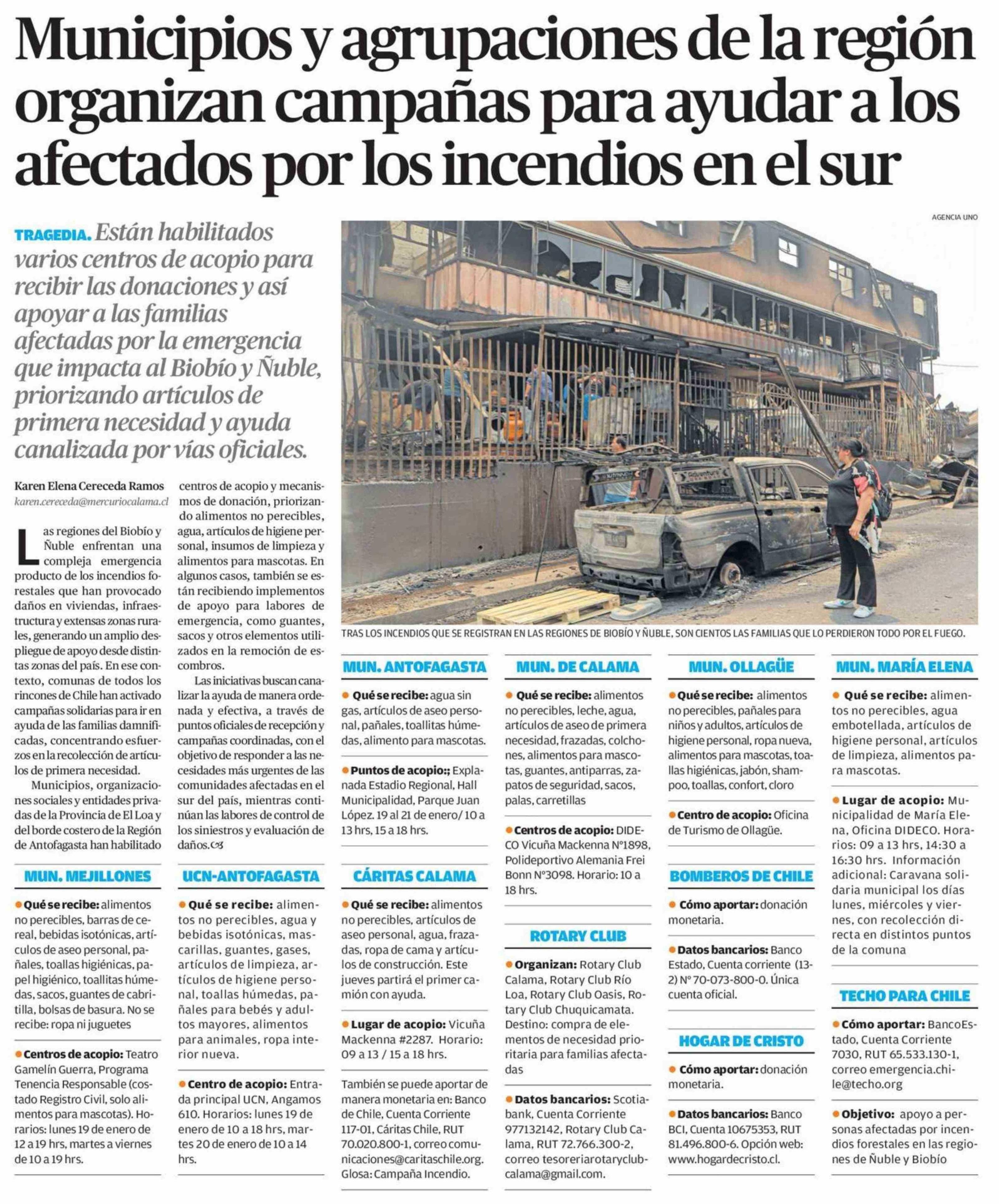 Título: Municipios y agrupaciones de la región organizan campañas para ayudar a los afectados por los incendios en el sur