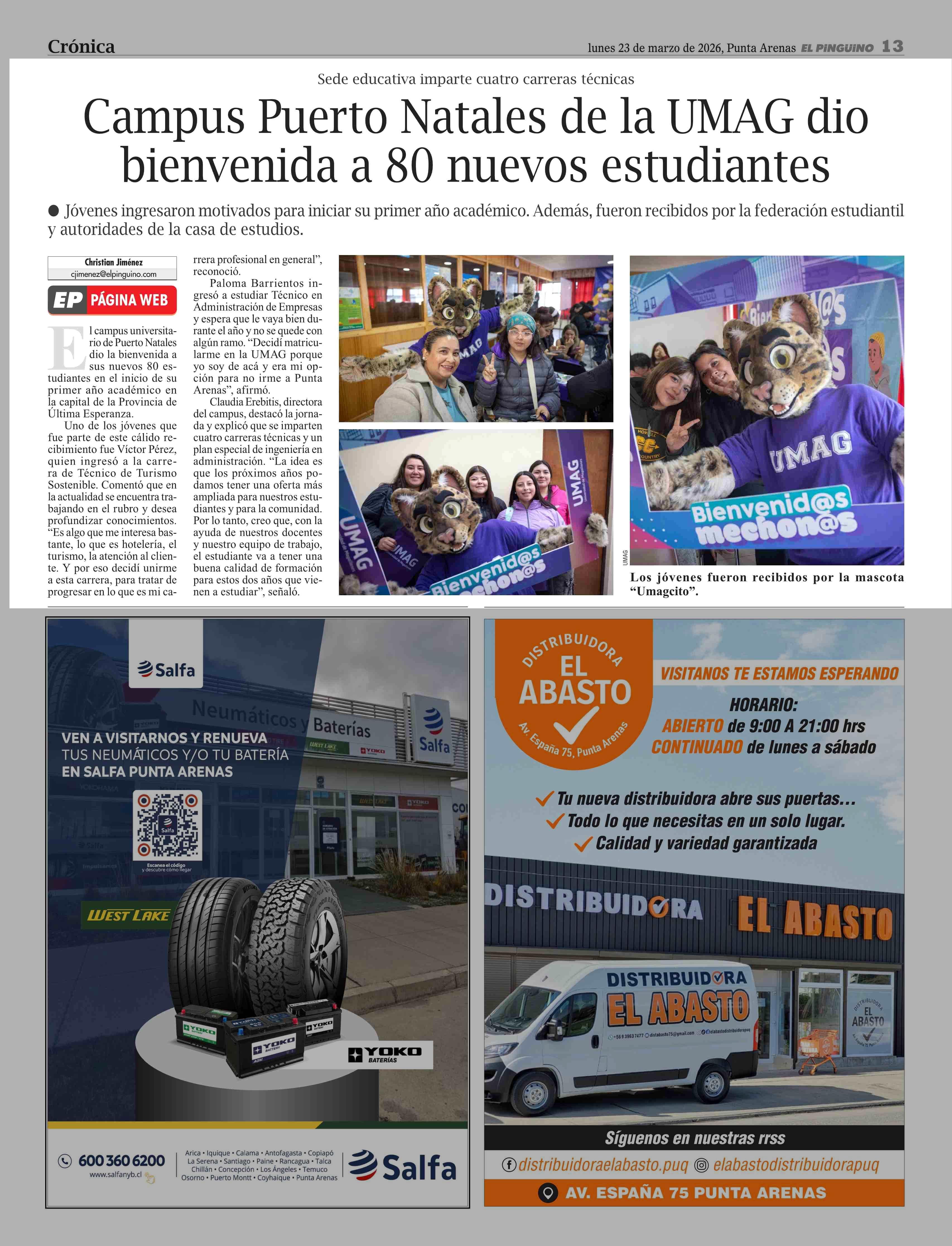 Campus Puerto Natales de la UMAG dio bienvenida a 80 nuevos estudiantes 23-03-2026 El Pingüino |