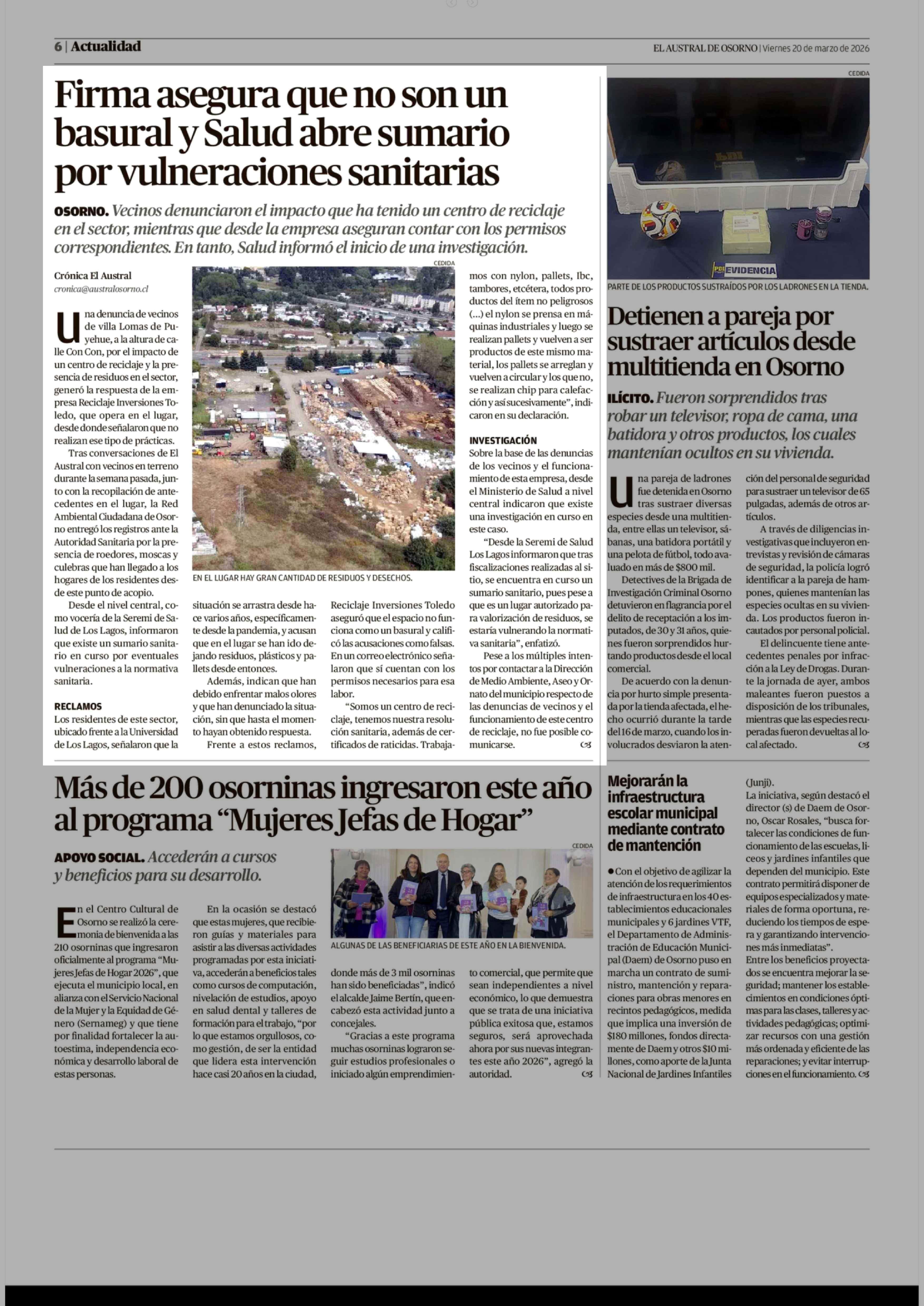 Firma asegura que no son un basural y Salud abre sumario por vulneraciones sanitarias 20-03-2026 El Austral de Osorno |