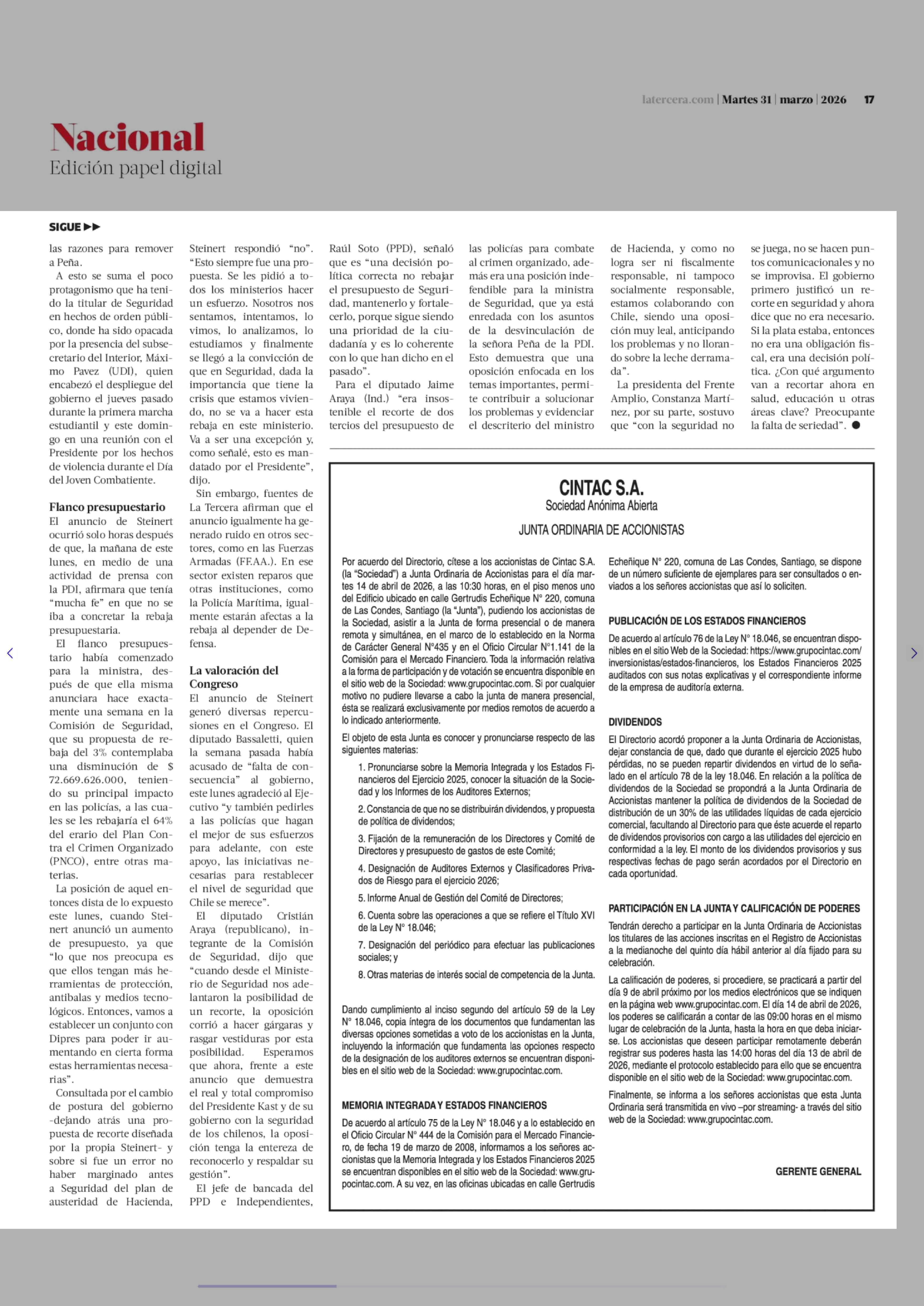 Gobierno le da un respiro a Steinert en su peor semana y revierte recorte presupuestario en Seguridad 31-03-2026 La Tercera |
