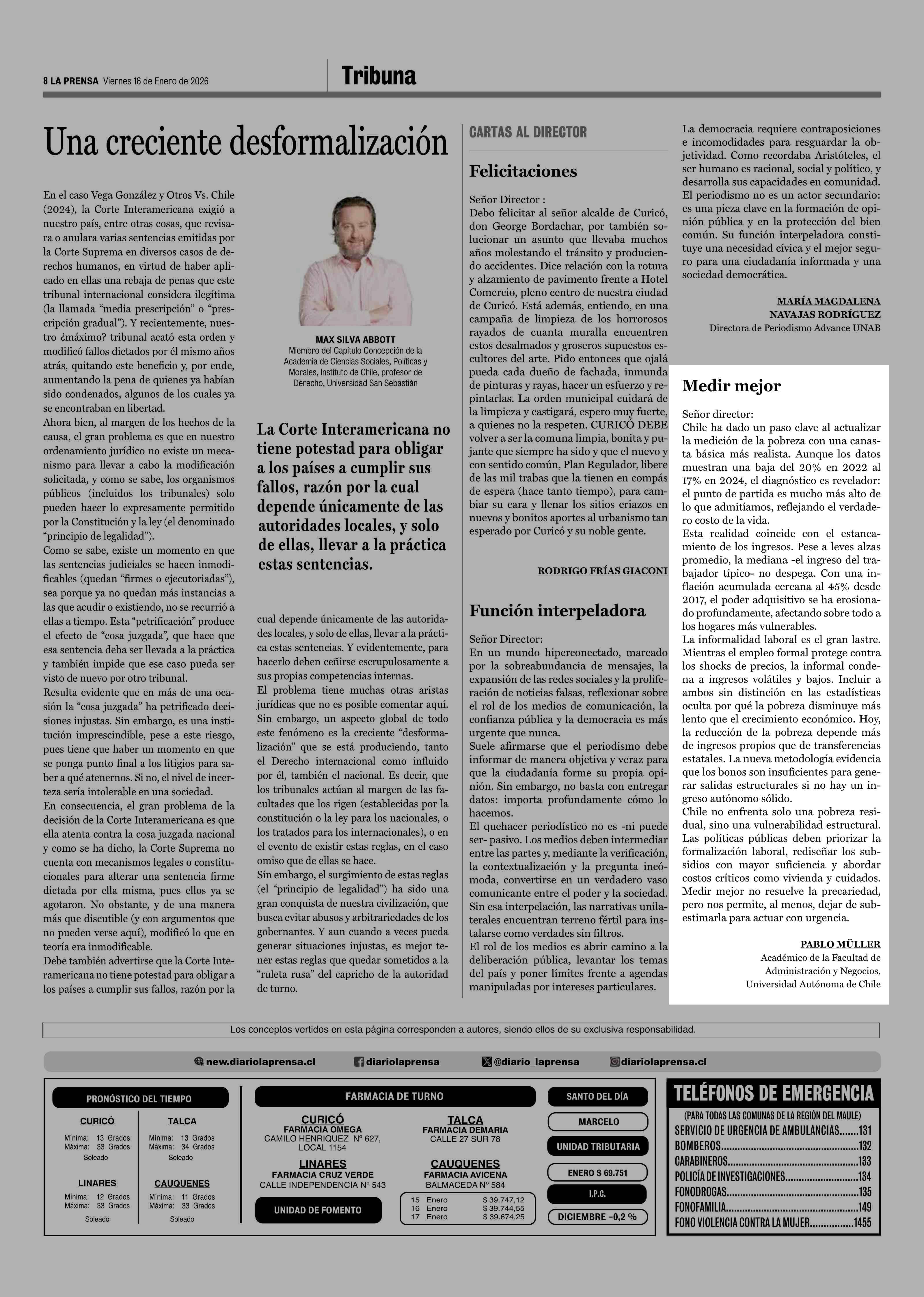 Cartas: Medir mejor 16-01-2026 La Prensa de Curicó |