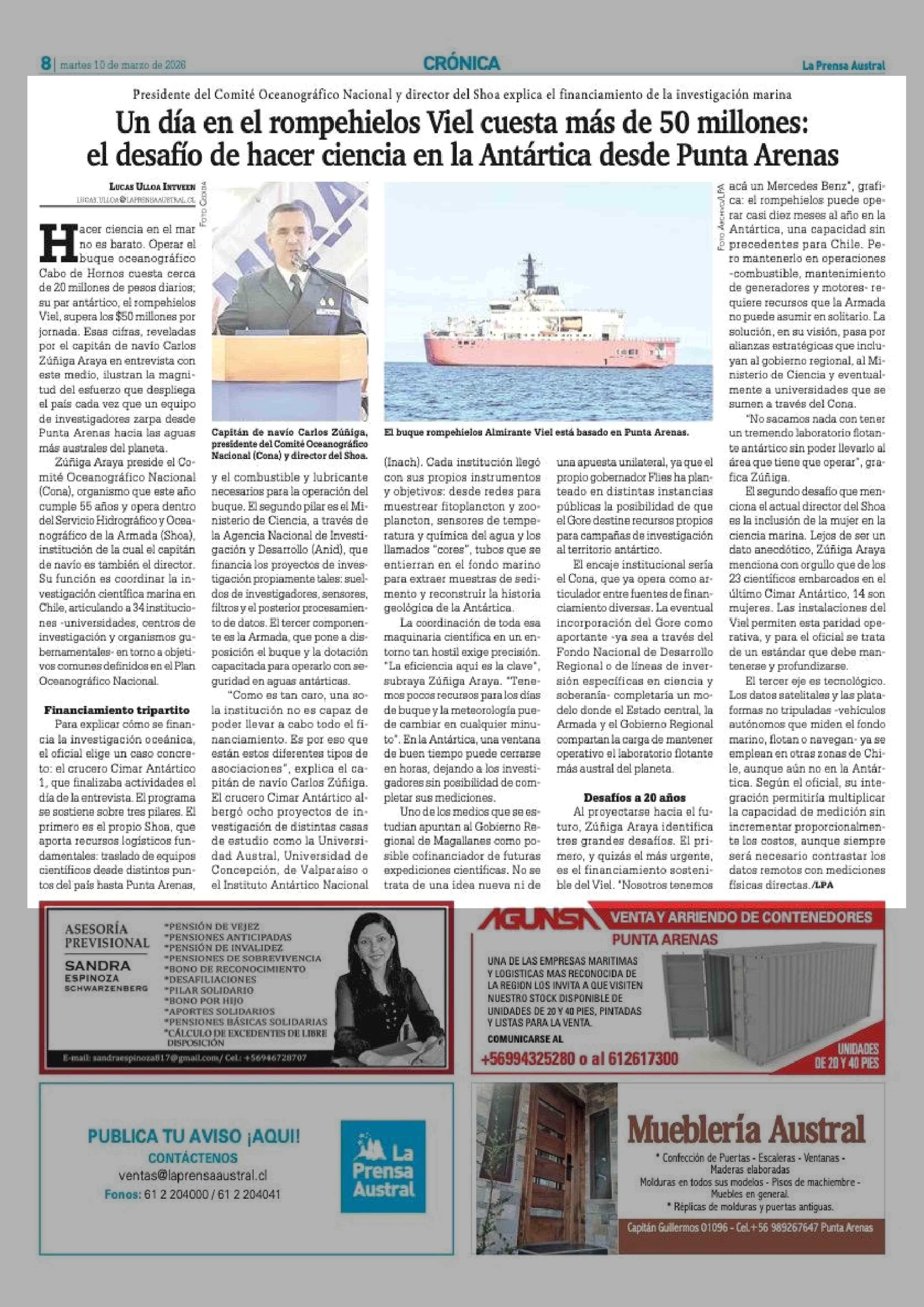 Un día en el rompehielos Viel cuesta más de 50 millones: el desafío de hacer ciencia en la Antártica desde Punta Arenas 10-03-2026 La Prensa Austral |