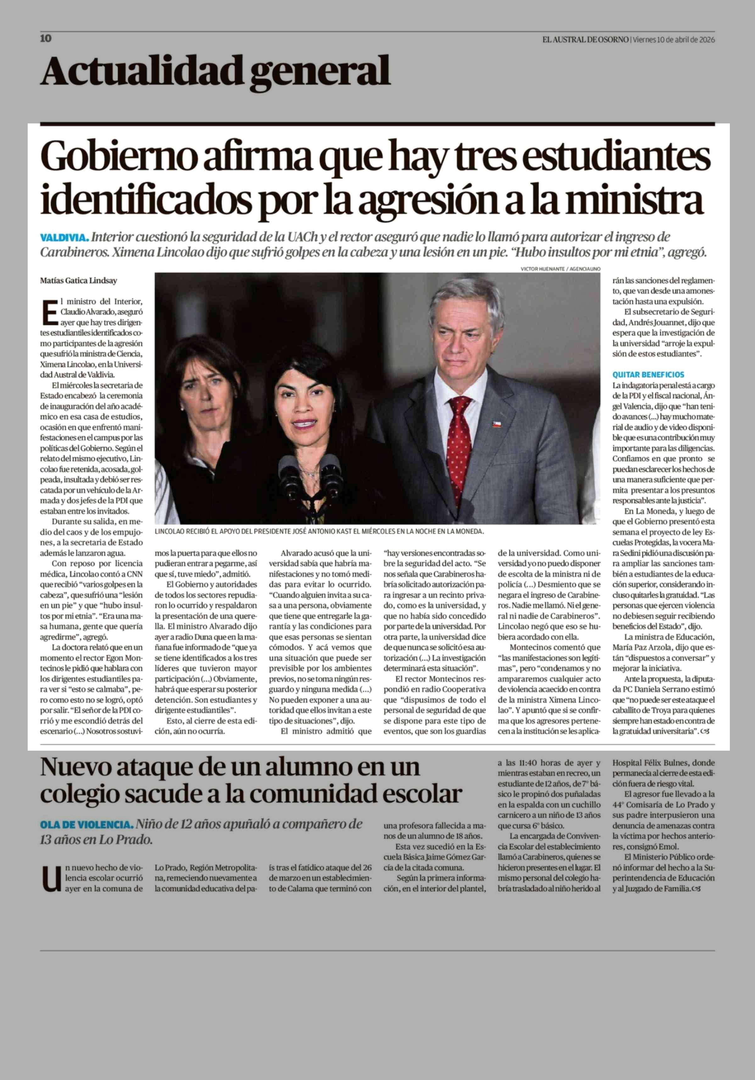 Gobierno afirma que hay tres estudiantes identificados por la agresión a la ministra 10-04-2026 El Austral de Osorno |