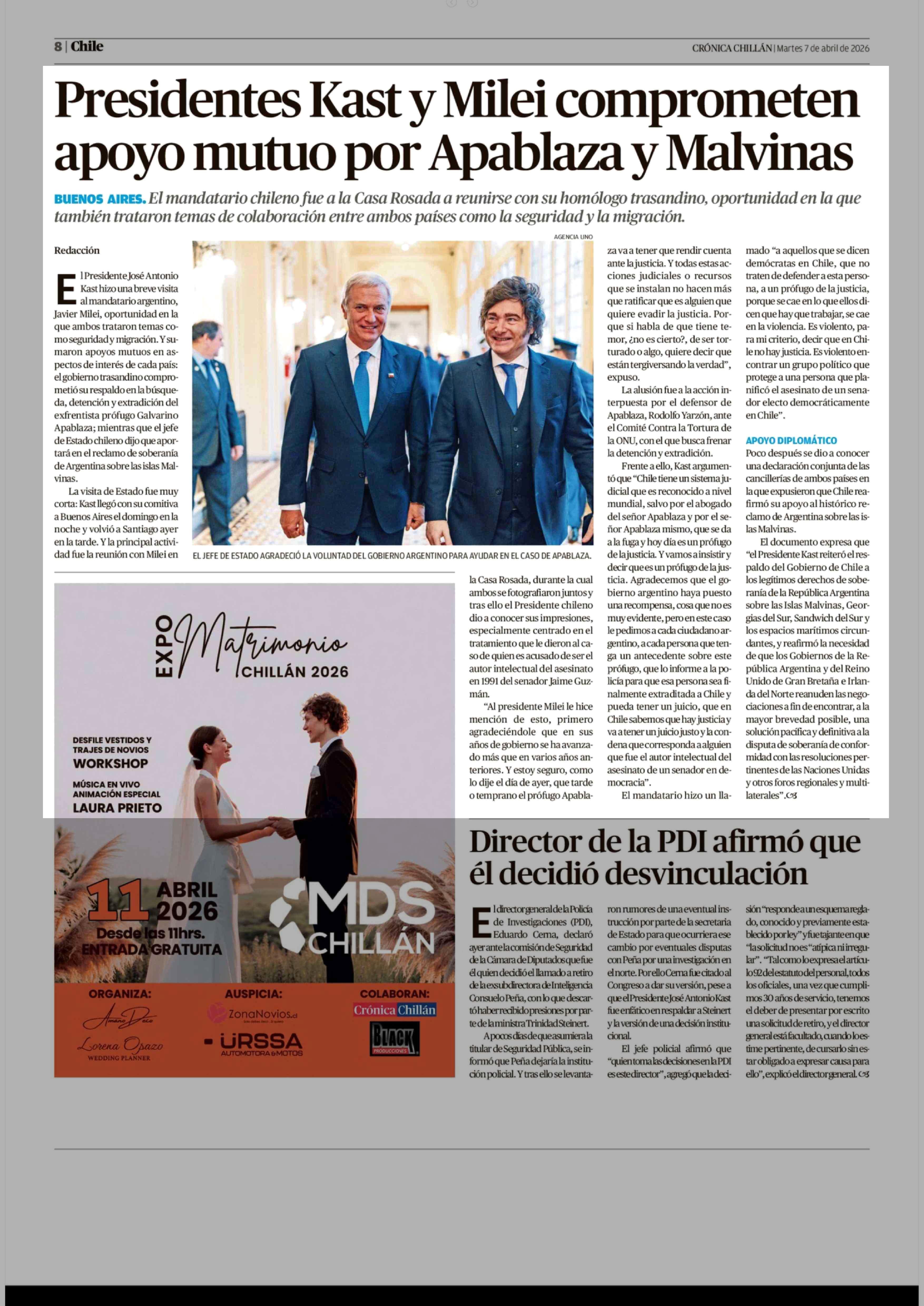 Título: Presidentes Kast y Milei comprometen apoyo mutuo por Apablaza y Malvinas