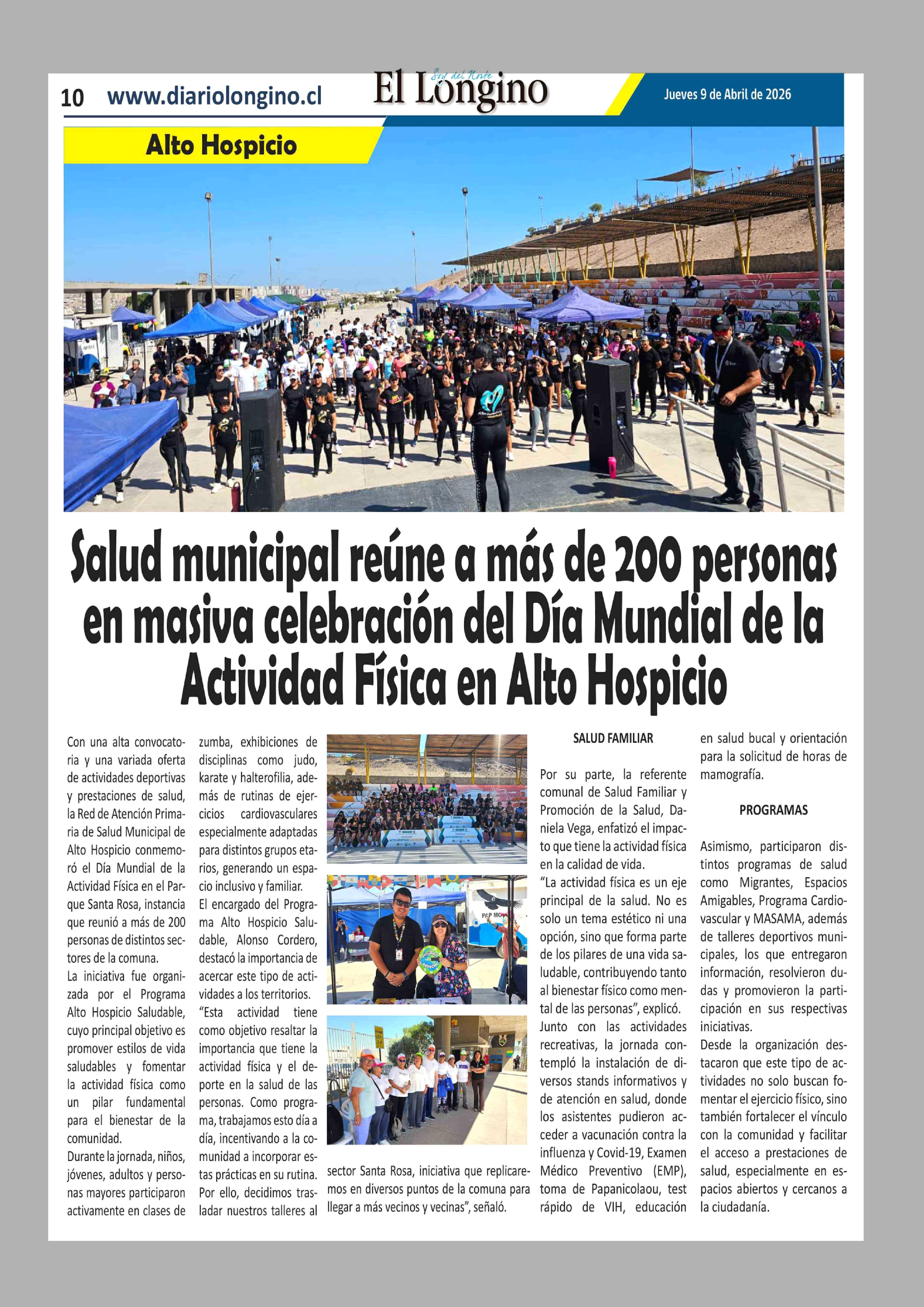 Salud municipal reúne a más de 200 personas en masiva celebración del Día Mundial de la Actividad Física en Alto Hospicio 09-04-2026 El Longino |