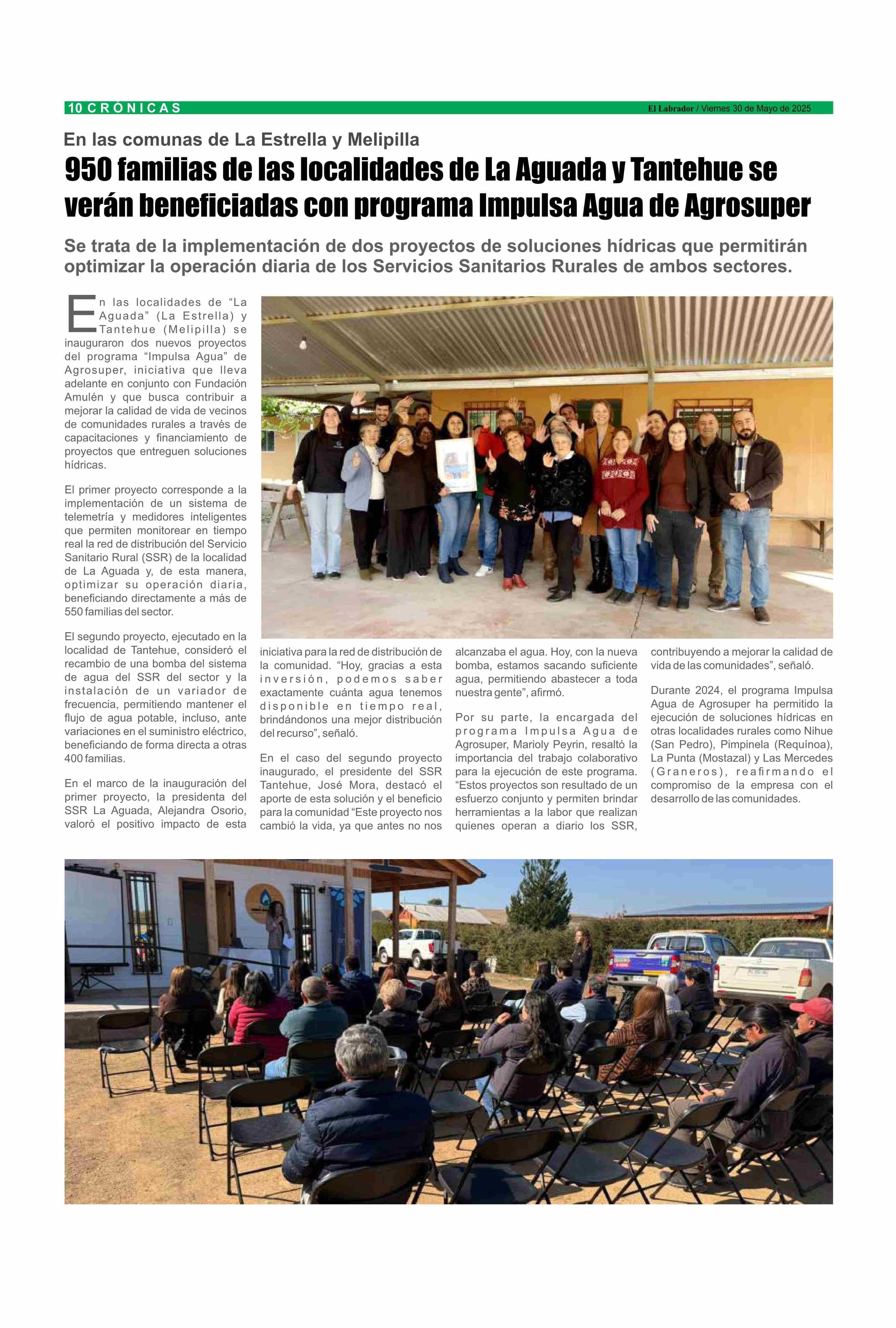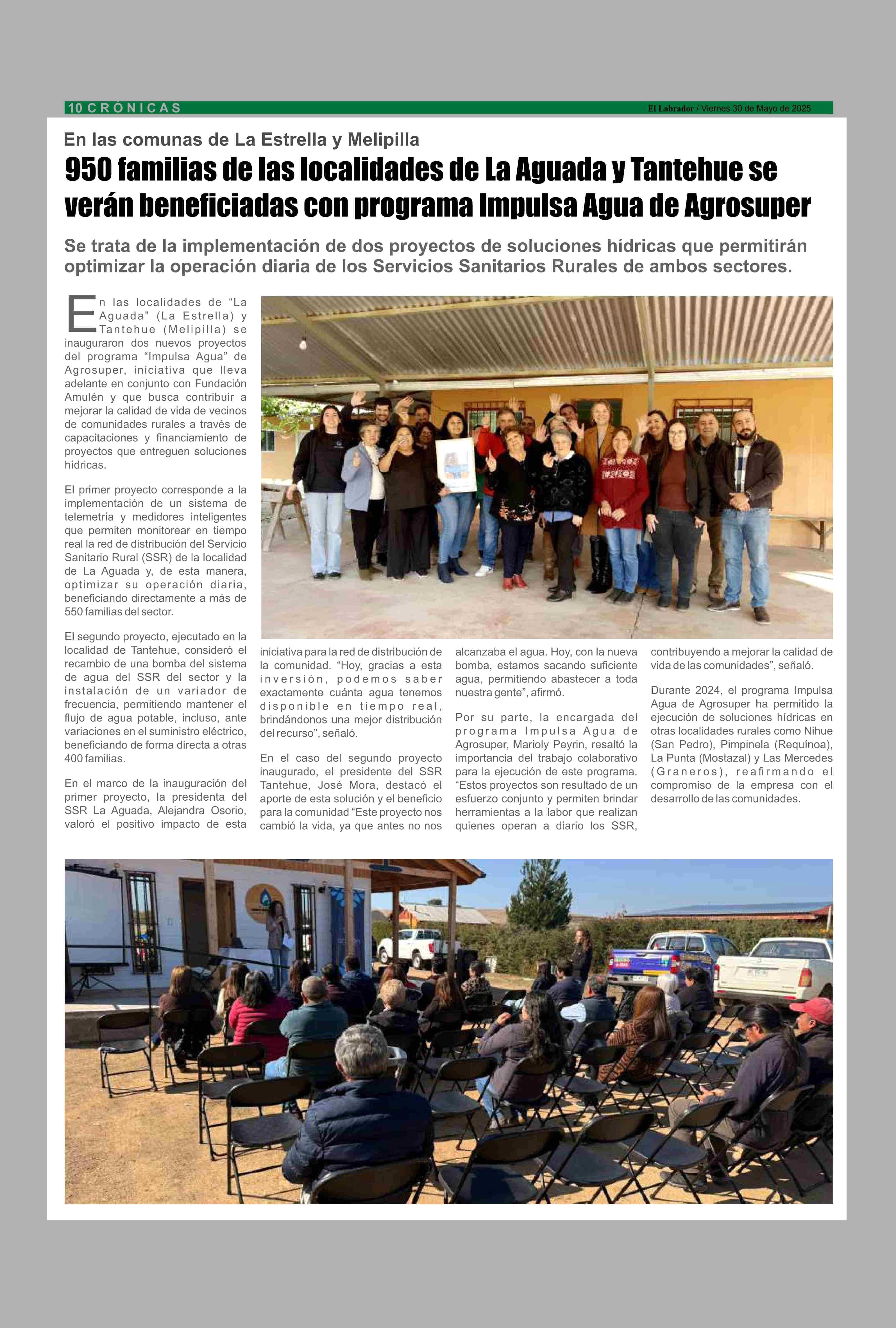 950 familias de las localidades de La Aguada y Tantehue se verán beneficiadas con programa Impulsa Agua de Agrosuper 30-05-2025 El Labrador |