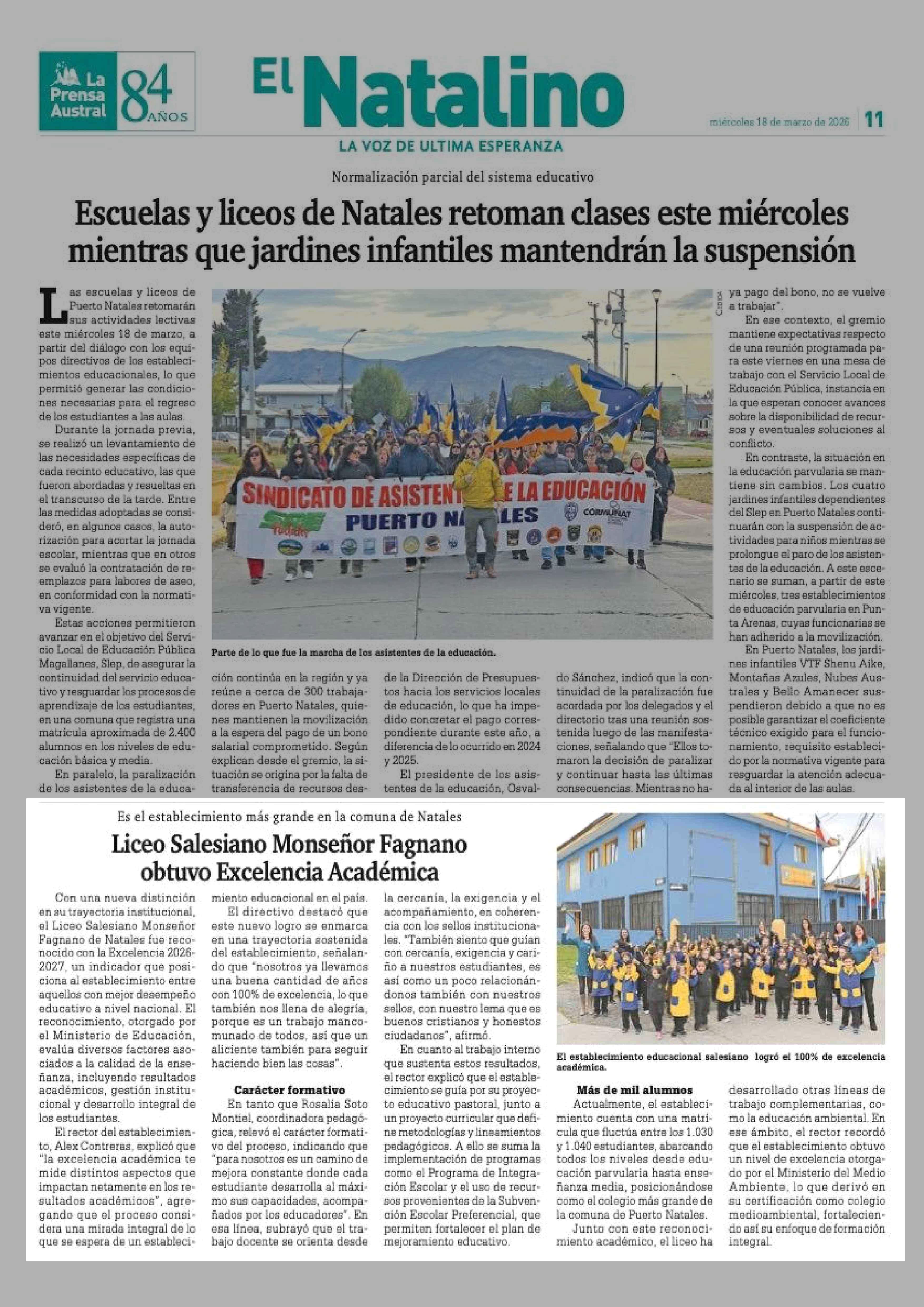 Liceo Salesiano Monseñor Fagnano obtuvo Excelencia Académica 18-03-2026 La Prensa Austral |