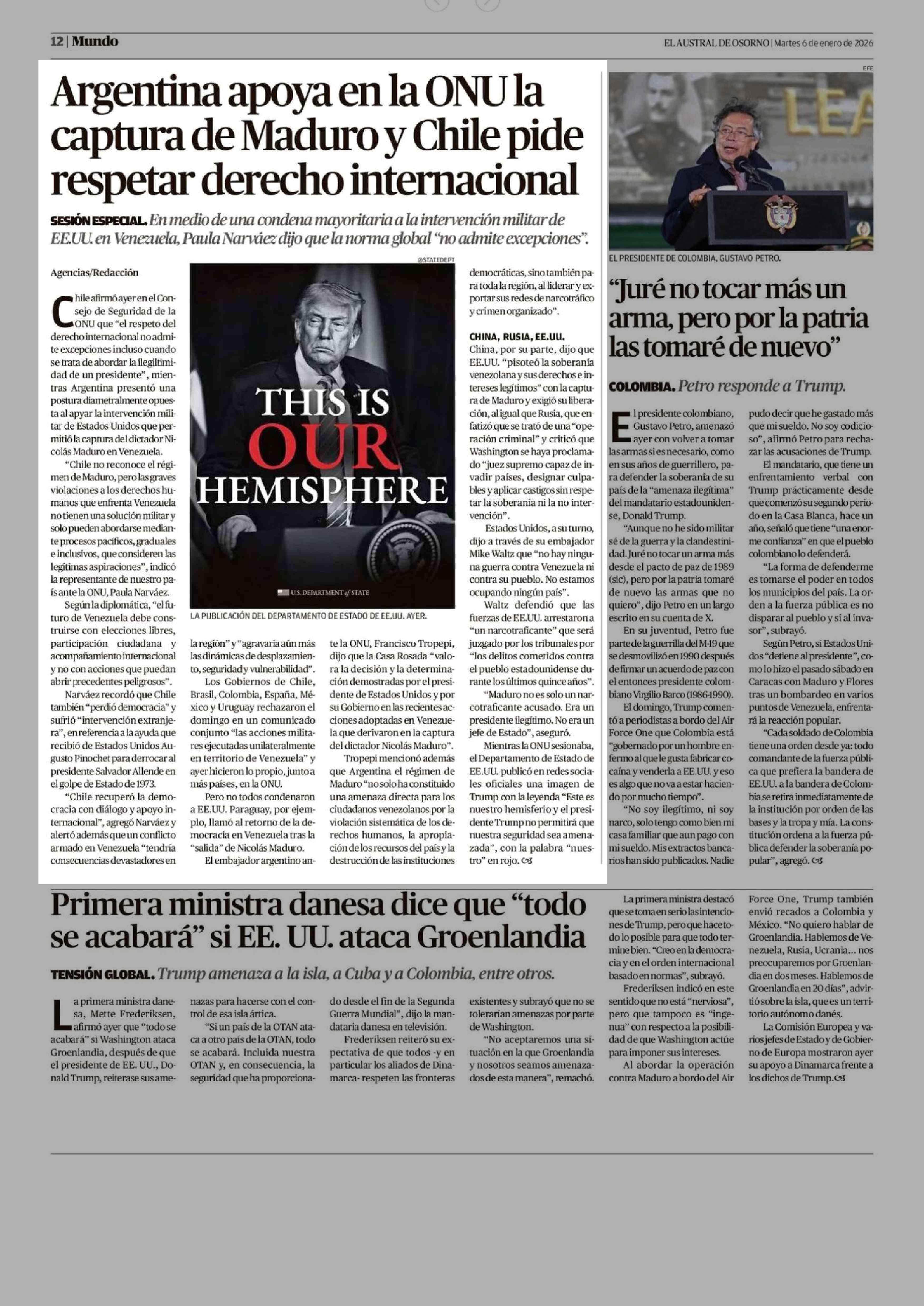 Argentina apoya en la ONU la captura de Maduro y Chile pide respetar derecho internacional 06-01-2026 El Austral de Osorno |