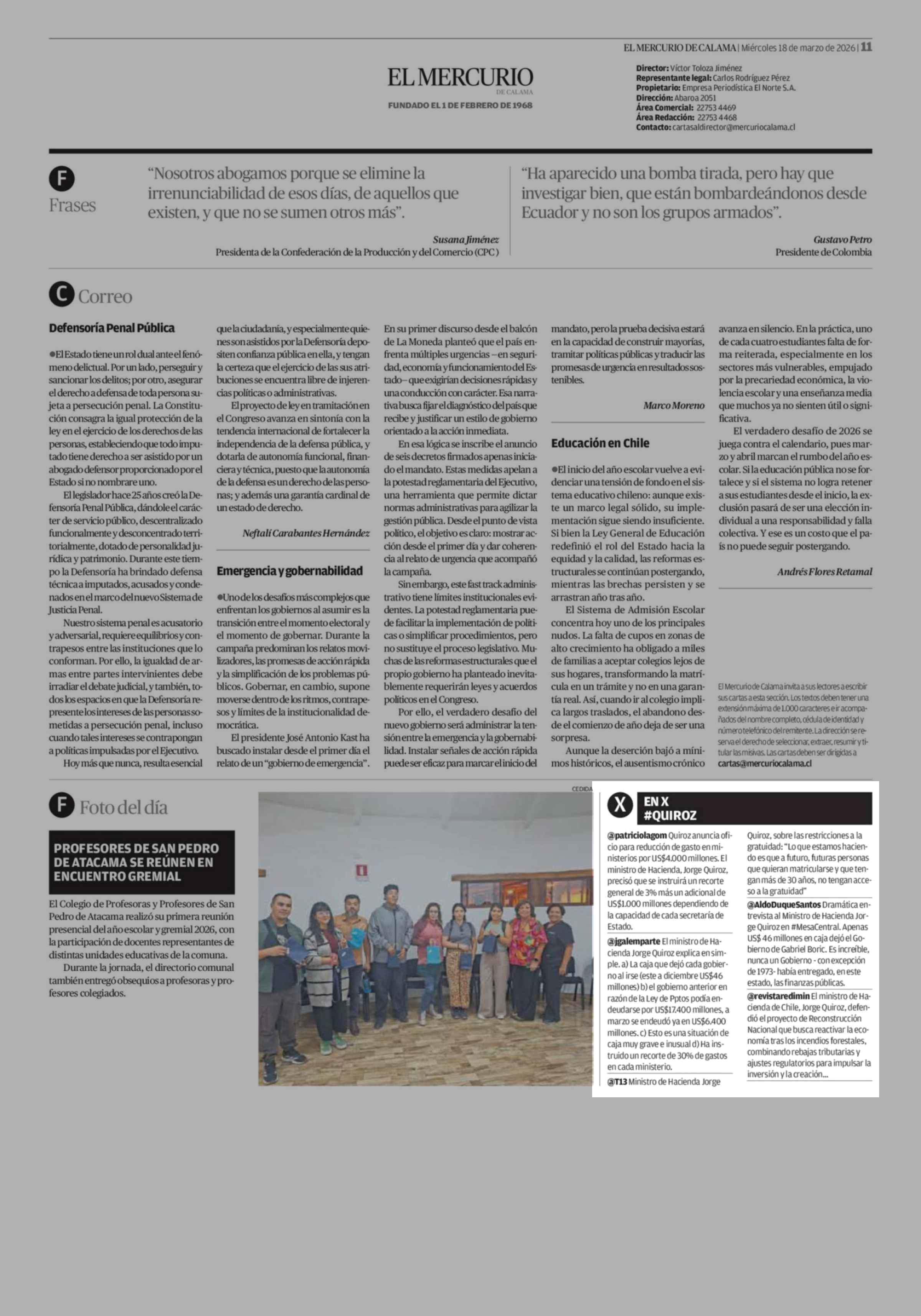 EN X #QUIROZ 18-03-2026 El Mercurio de Calama |