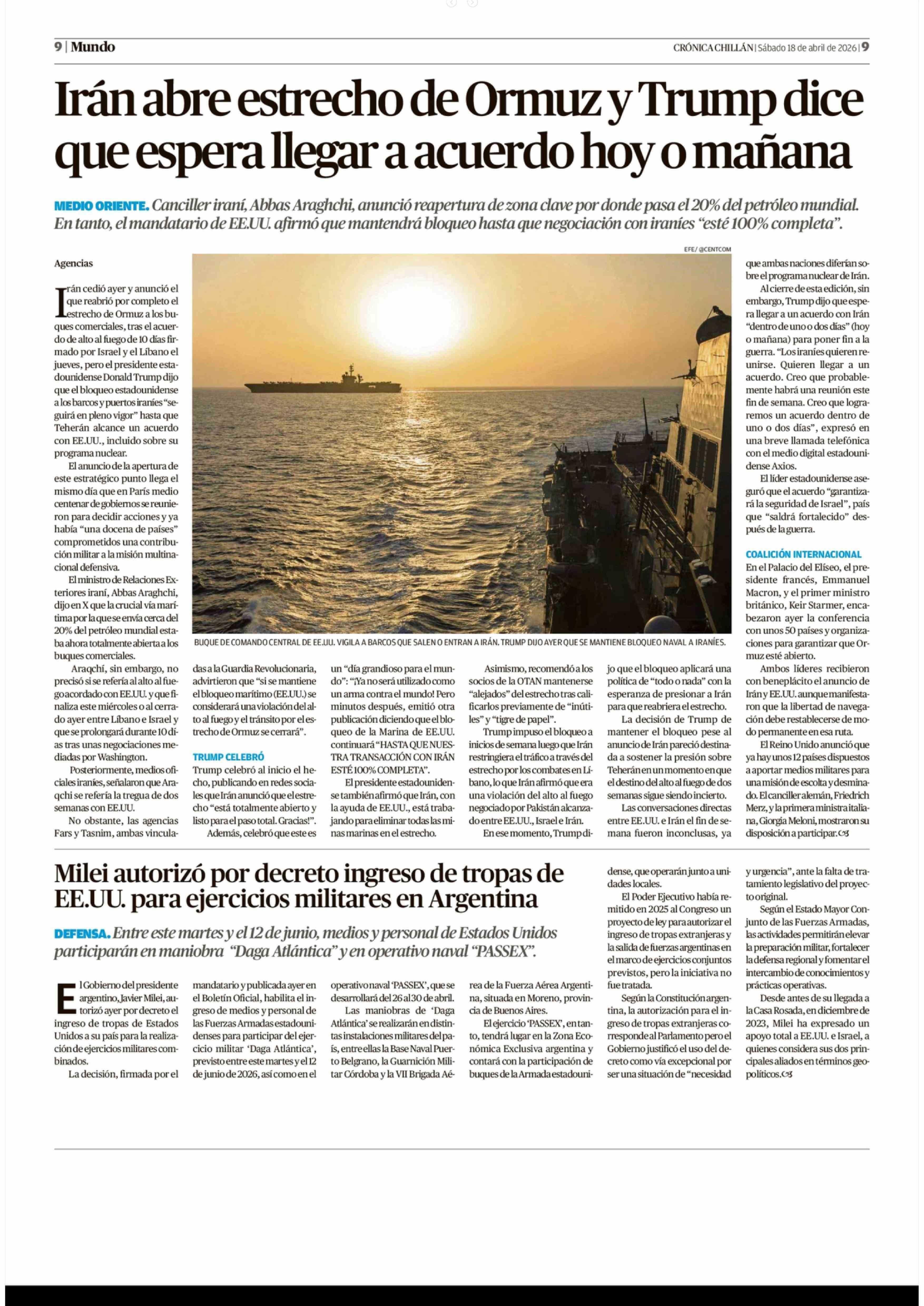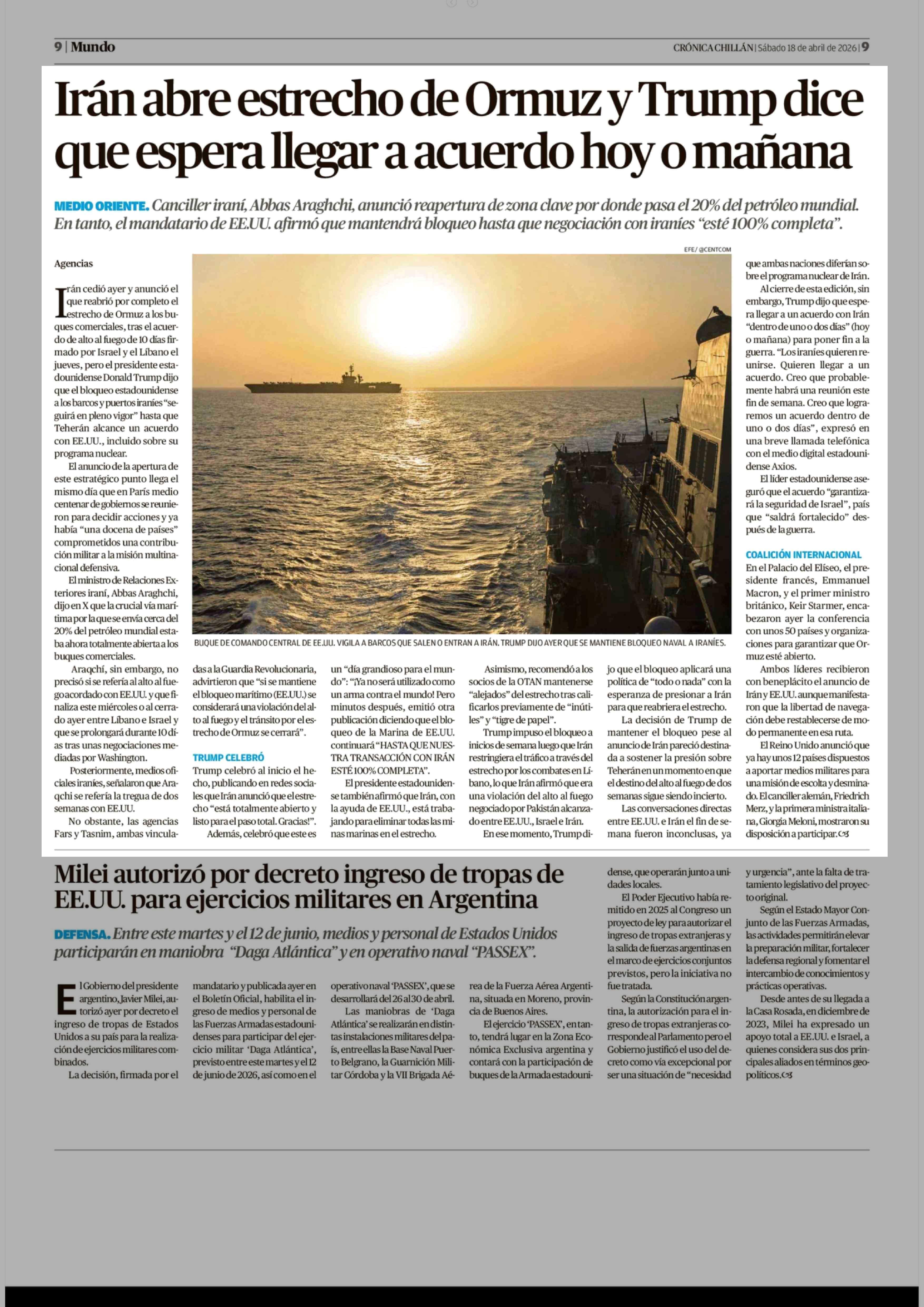 Irán abre estrecho de Ormuz y Trump dice que espera llegar a acuerdo hoy o mañana 18-04-2026 Crónica de Chillán |