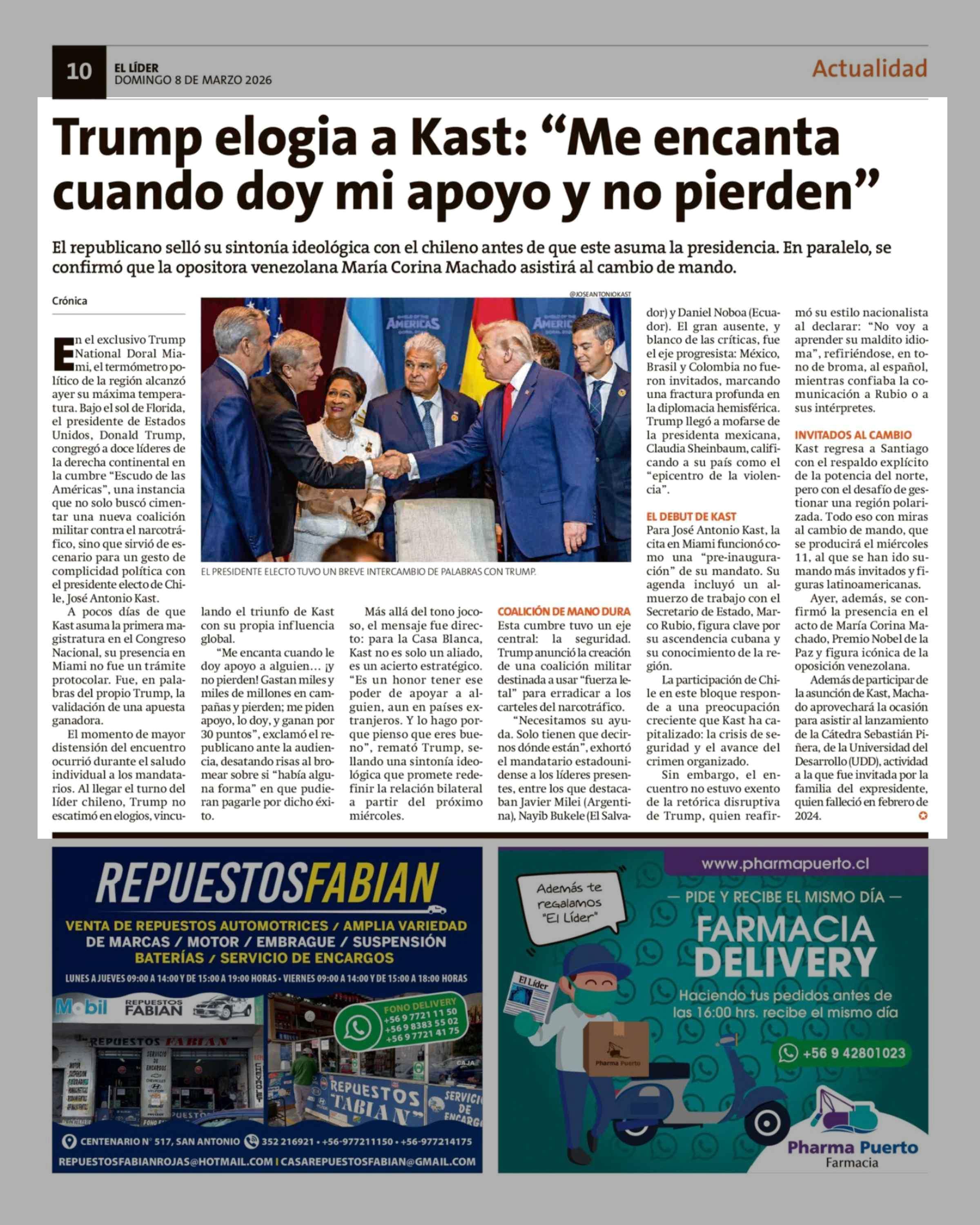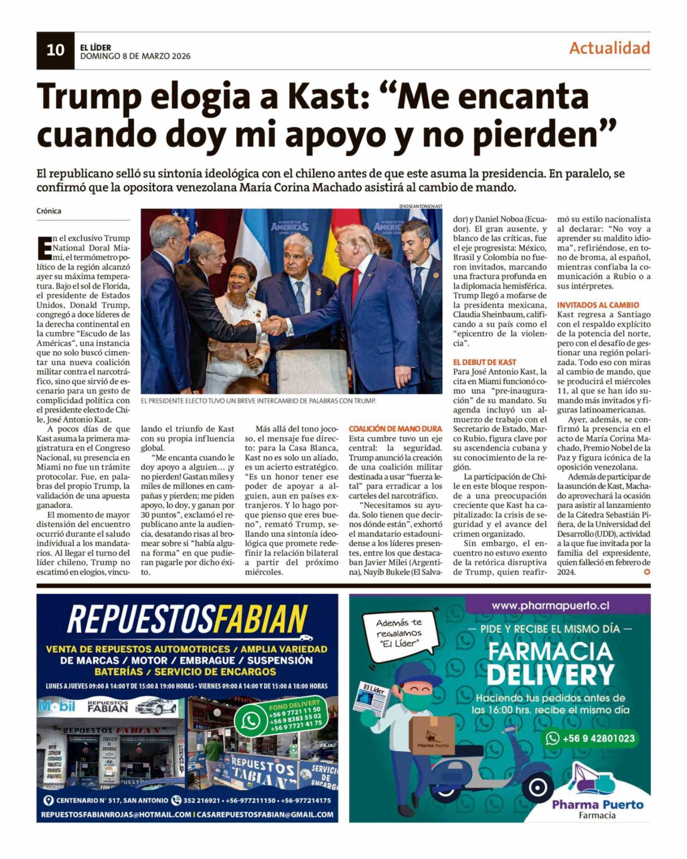 Trump elogia a Kast: "Me encanta cuando doy mi apoyo y no pierden" 08-03-2026 El Líder |