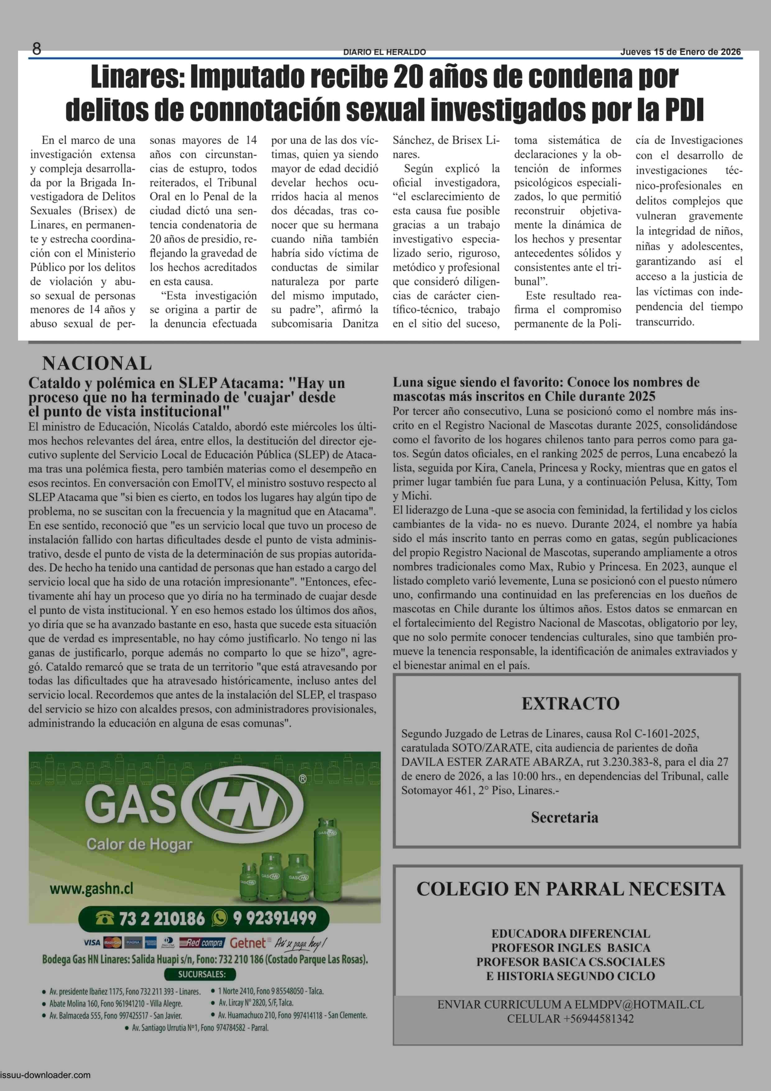 Linares: Imputado recibe 20 años de condena por delitos de connotación sexual investigados por la PDI 15-01-2026 El Heraldo |