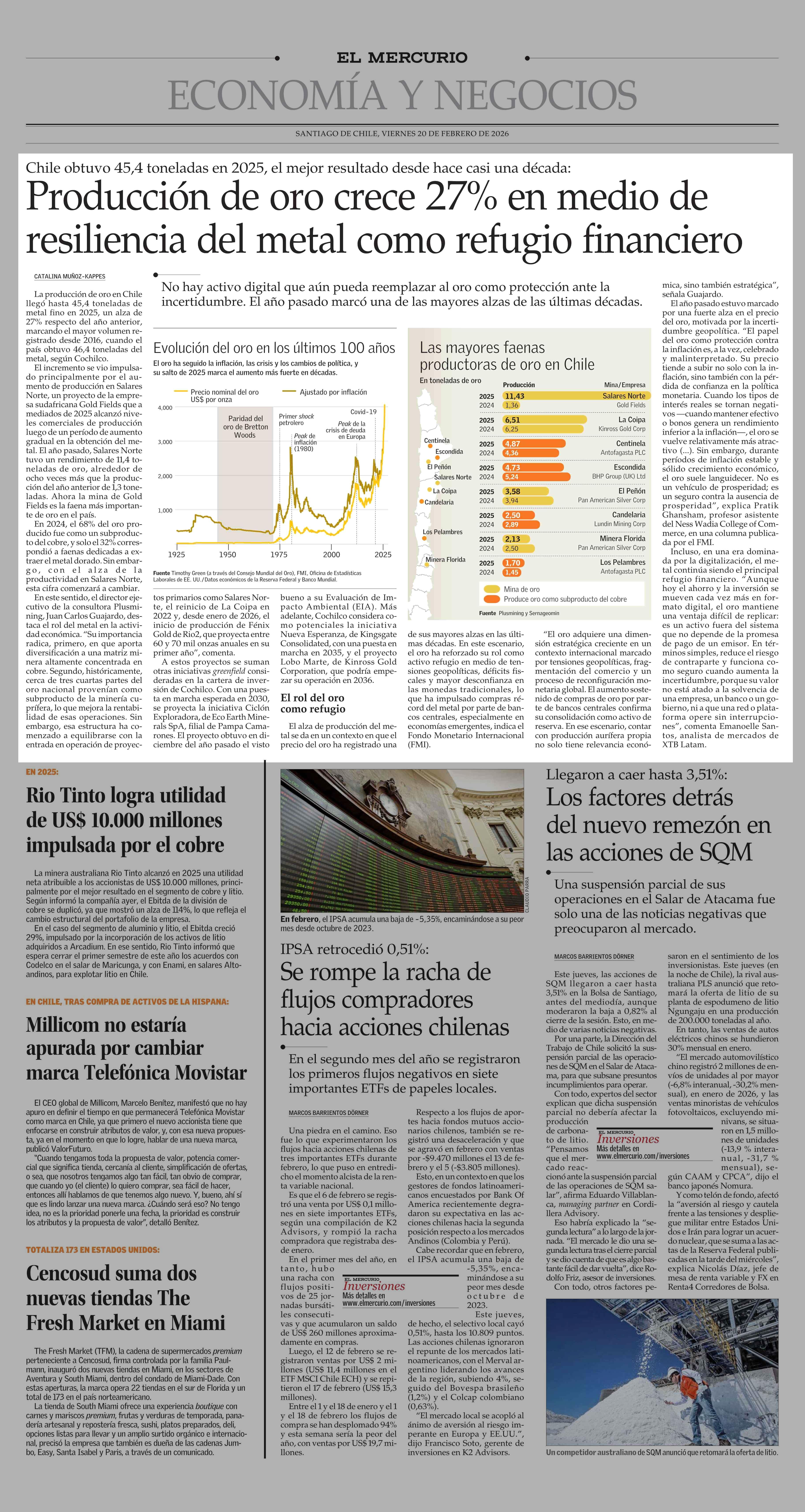Producción de oro crece 27% en medio de resiliencia del metal como refugio financiero 20-02-2026 El Mercurio |