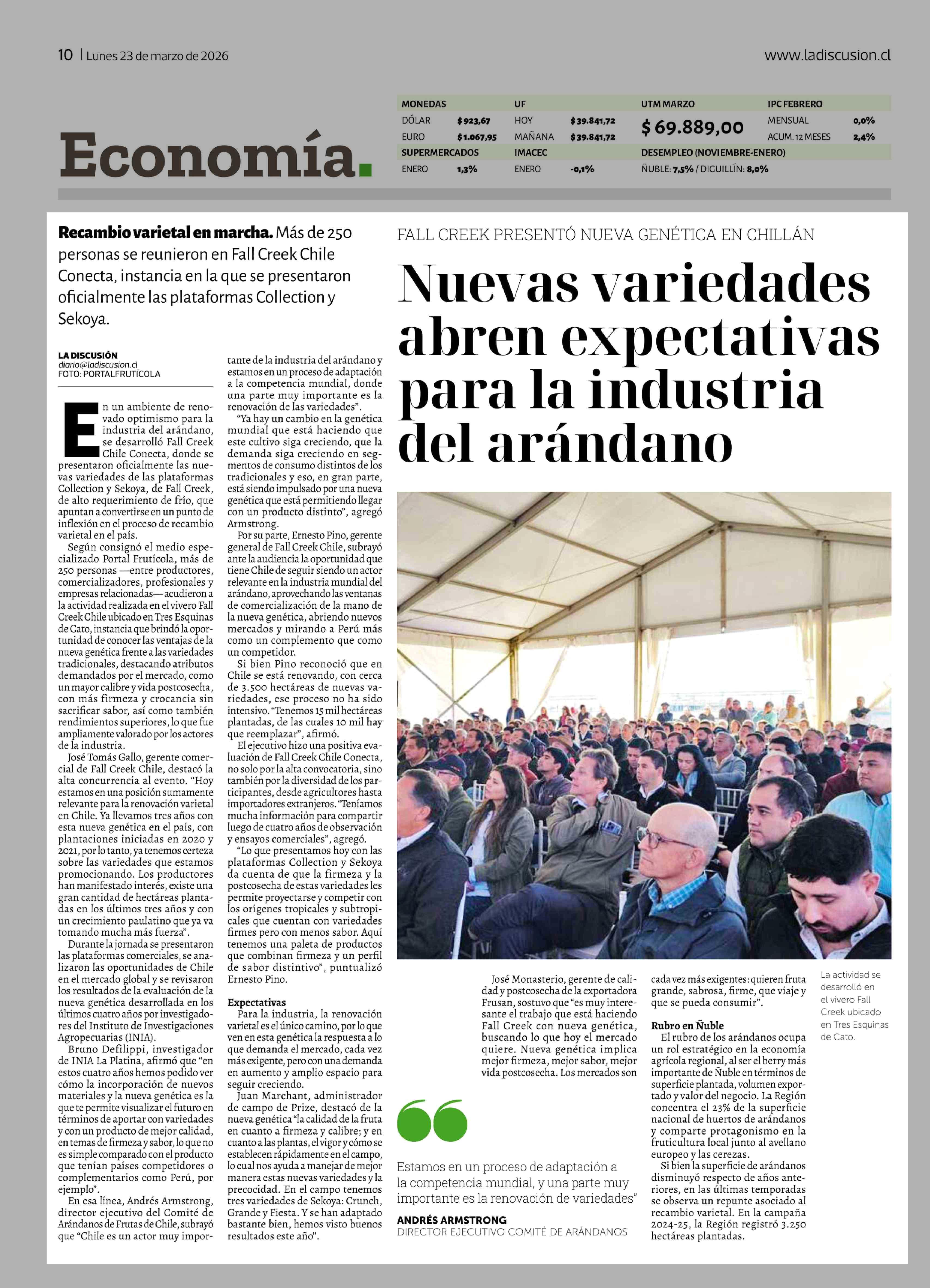 Nuevas variedades abren expectativas para la industria del arándano 23-03-2026 La Discusión |