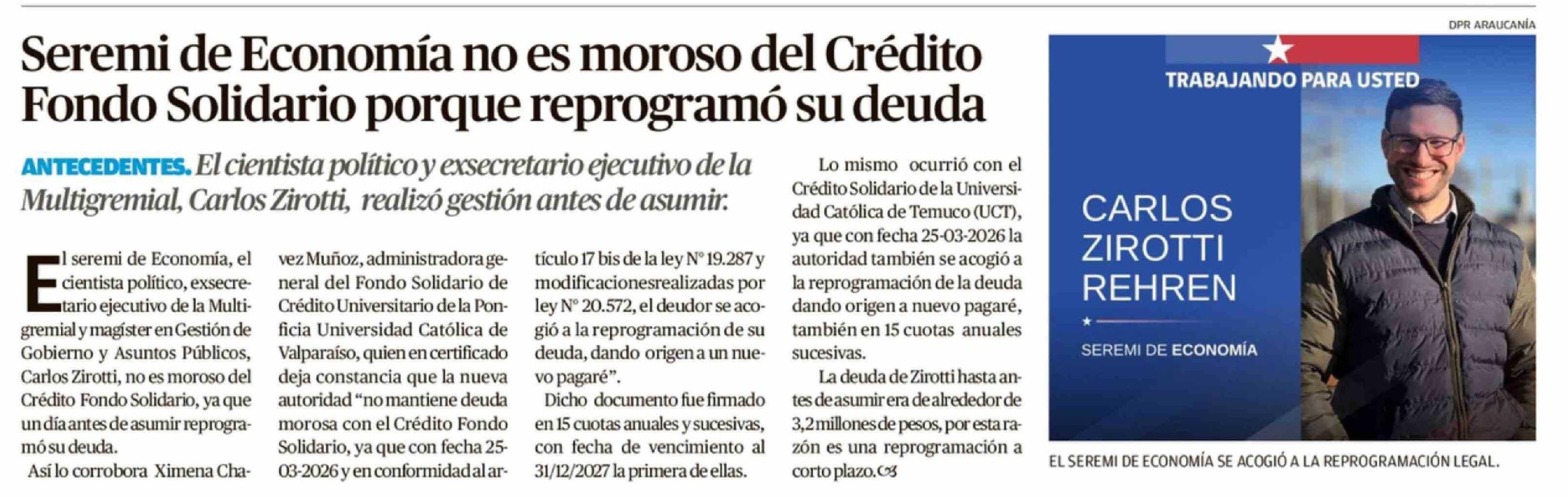 Título: Seremi de Economía no es moroso del Crédito Fondo Solidario porque reprogramó su deuda