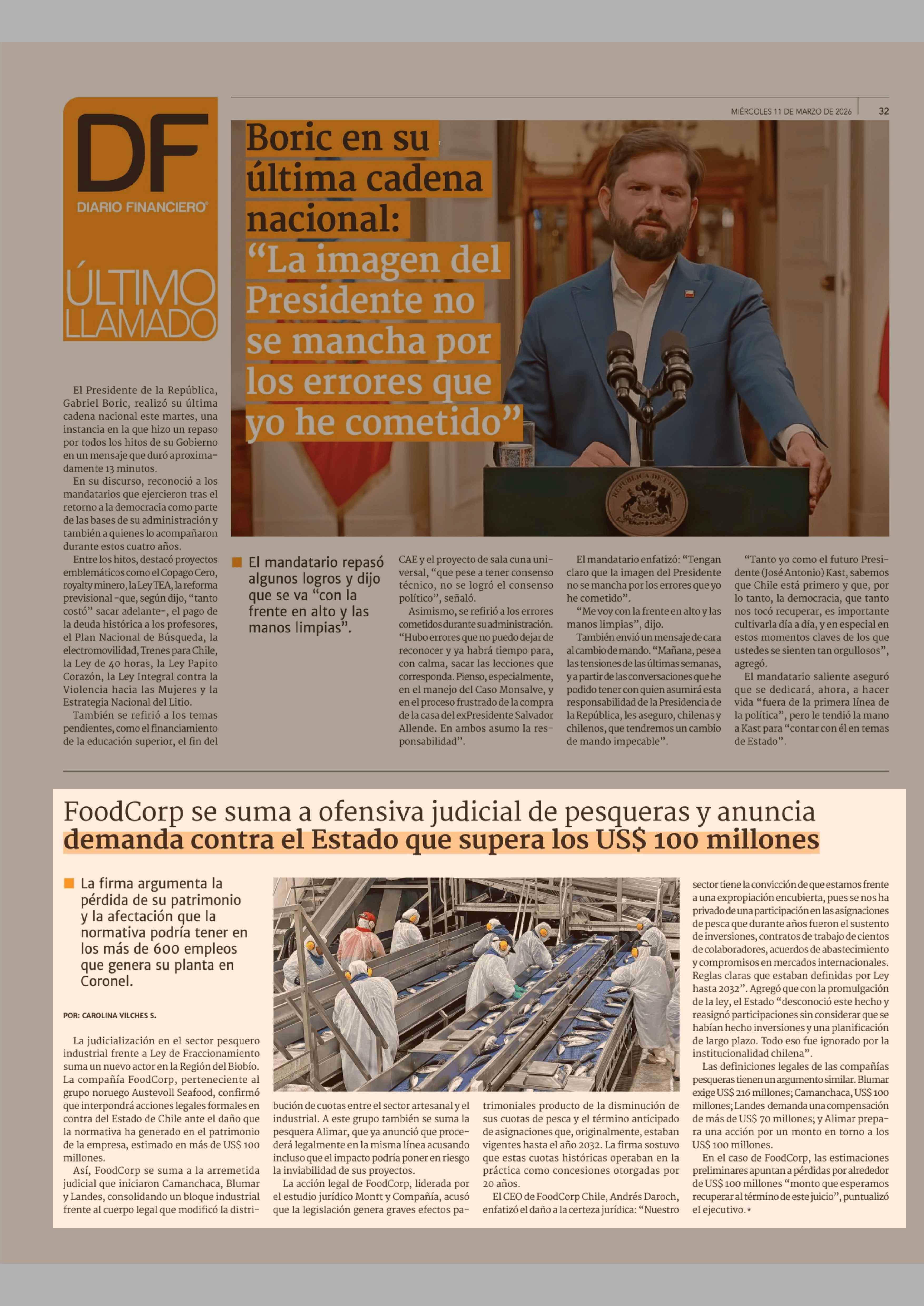 Título: FoodCorp se suma a ofensiva judicial de pesqueras y anuncia demanda contra el Estado que supera los US$ 100 millones