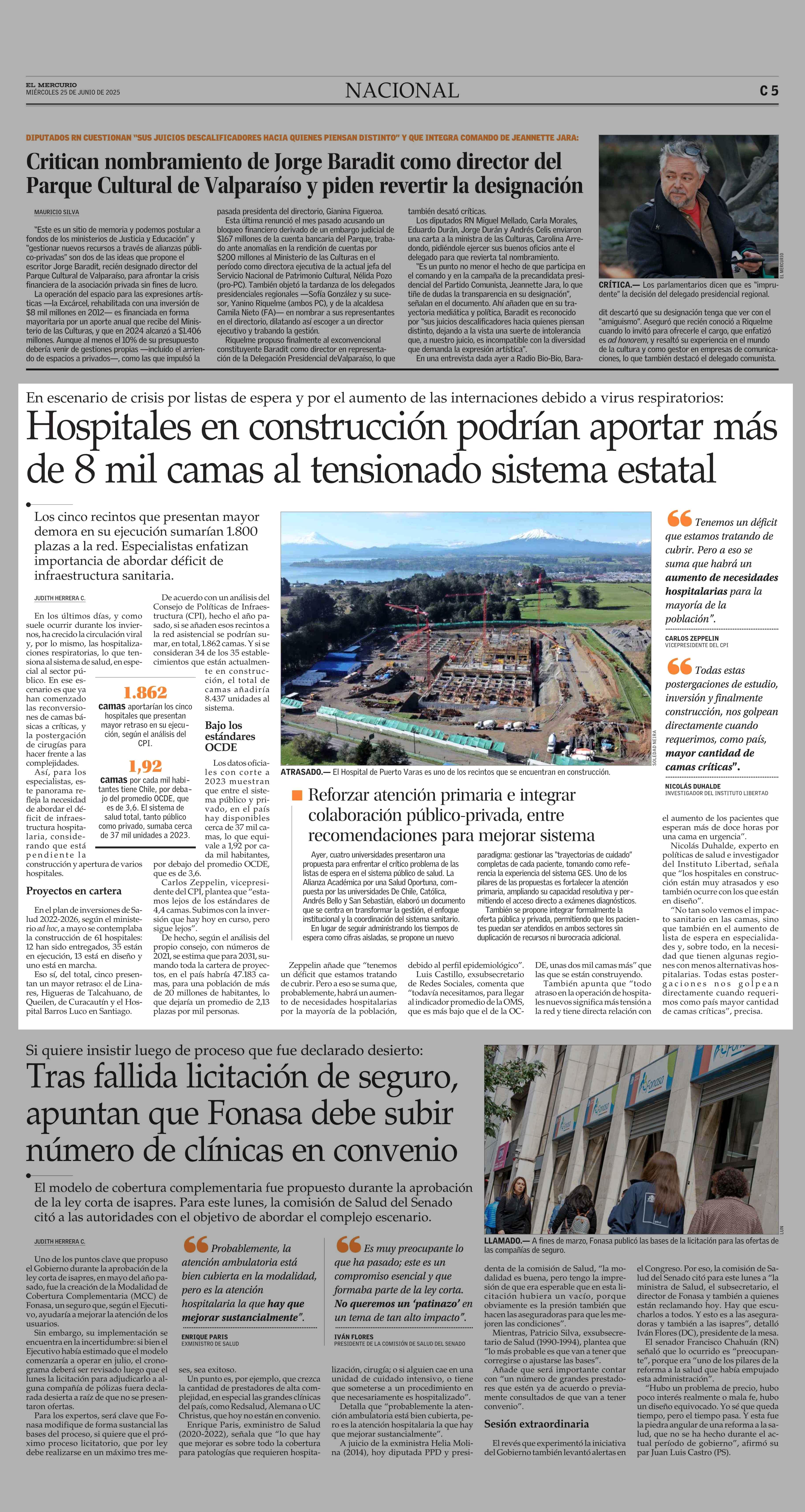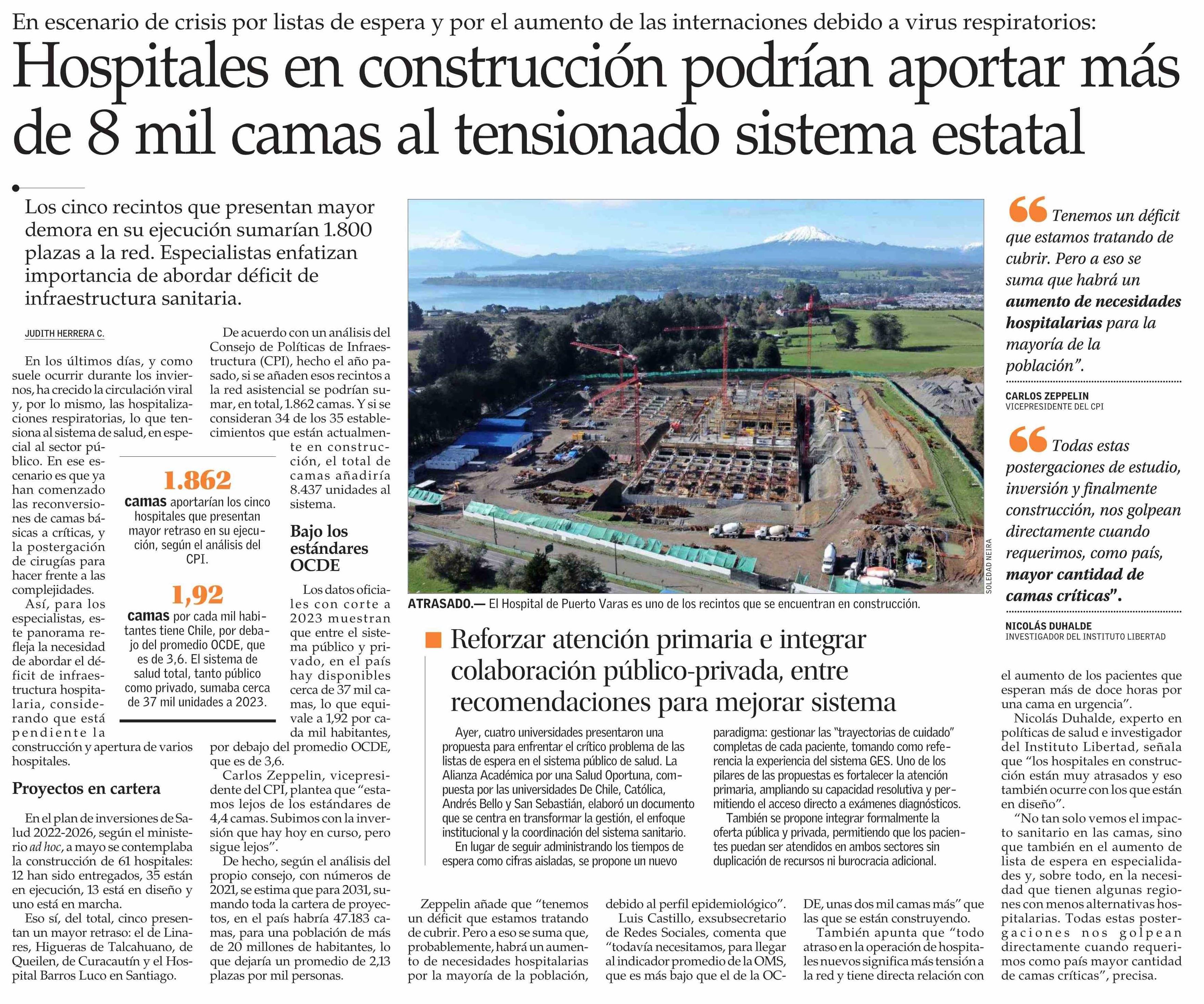 Hospitales en construcción podrían aportar más de 8 mil camas al tensionado sistema estatal 25-06-2025 El Mercurio |