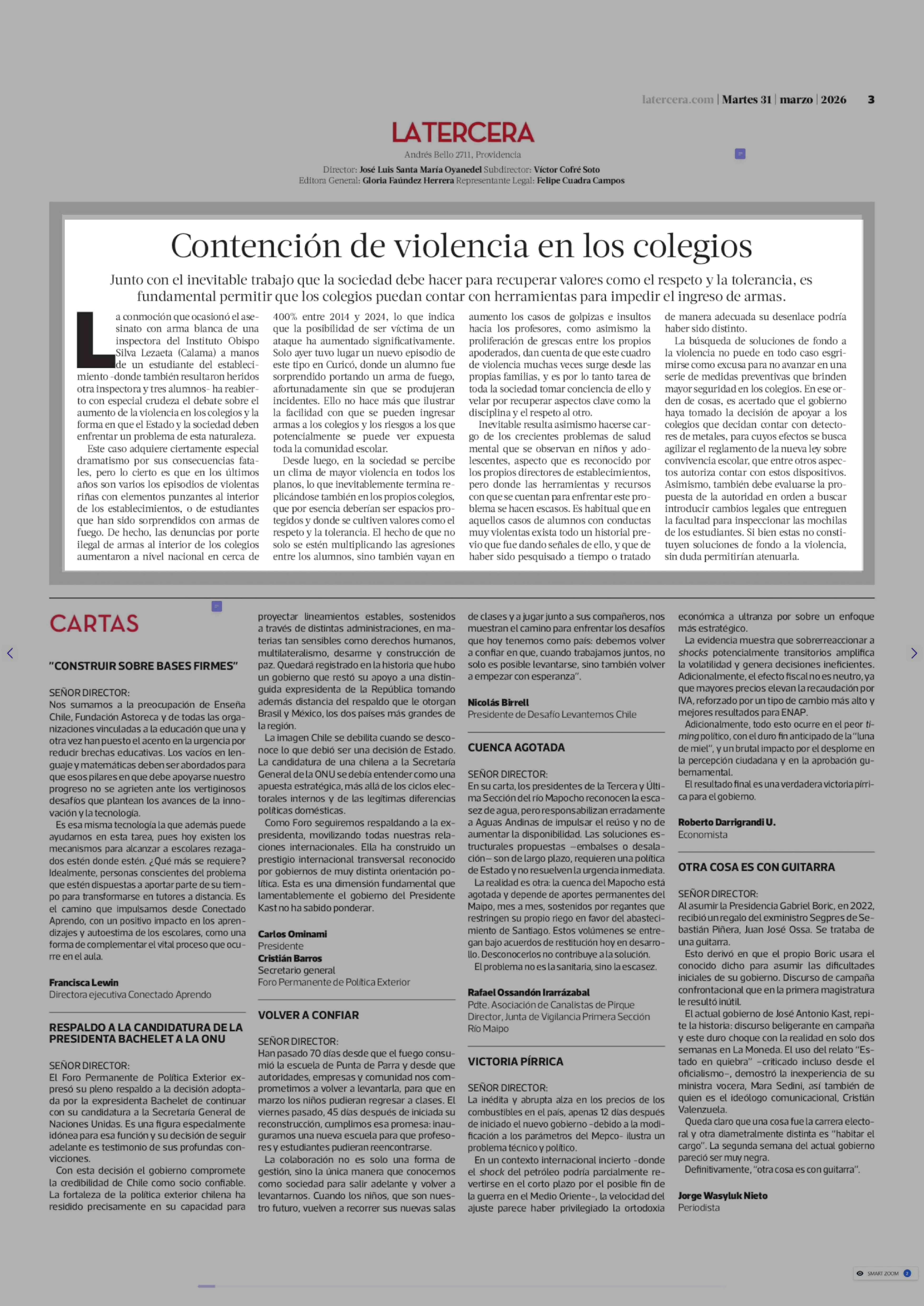 Editorial: Contención de violencia en los colegios 31-03-2026 La Tercera |
