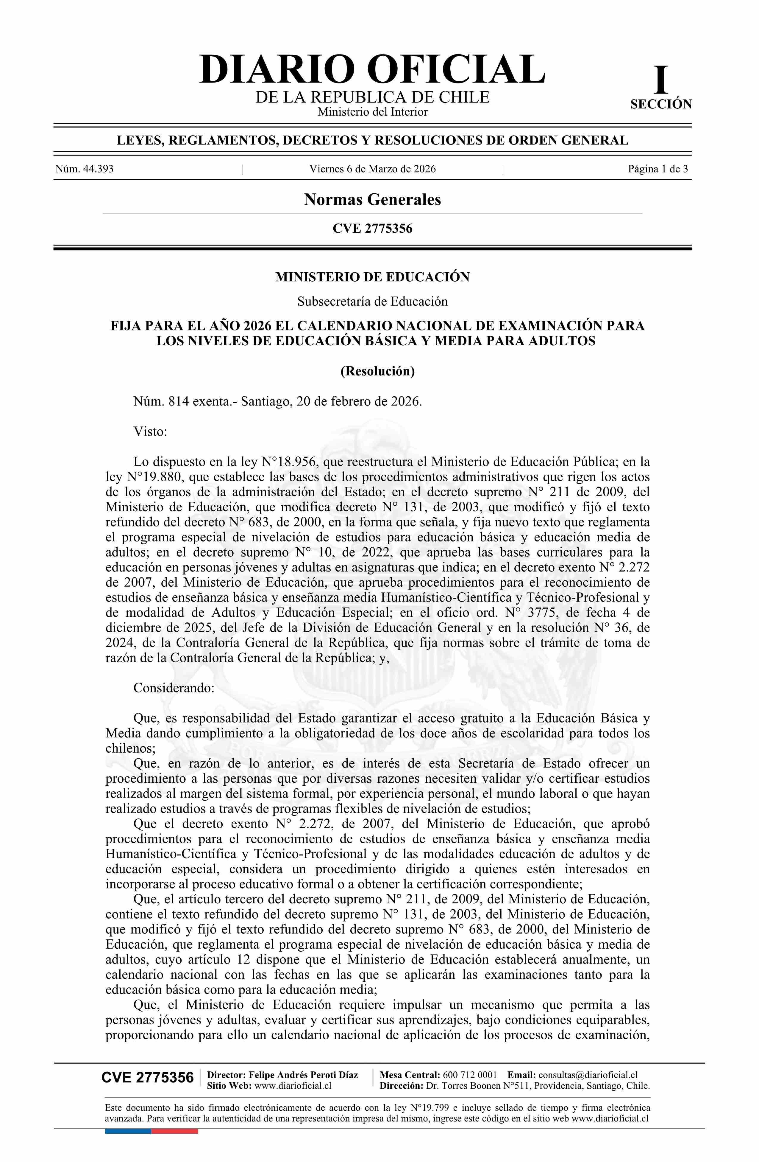 Resolución exenta número 814, de 2026.- Fija para el año 2026 el calendario nacional de examinación para los Niveles de Educación Básica y Media para Adultos 06-03-2026 DIARIO OFICIAL CHILE - BOLETÍN OFICIAL DE MINERÍA |