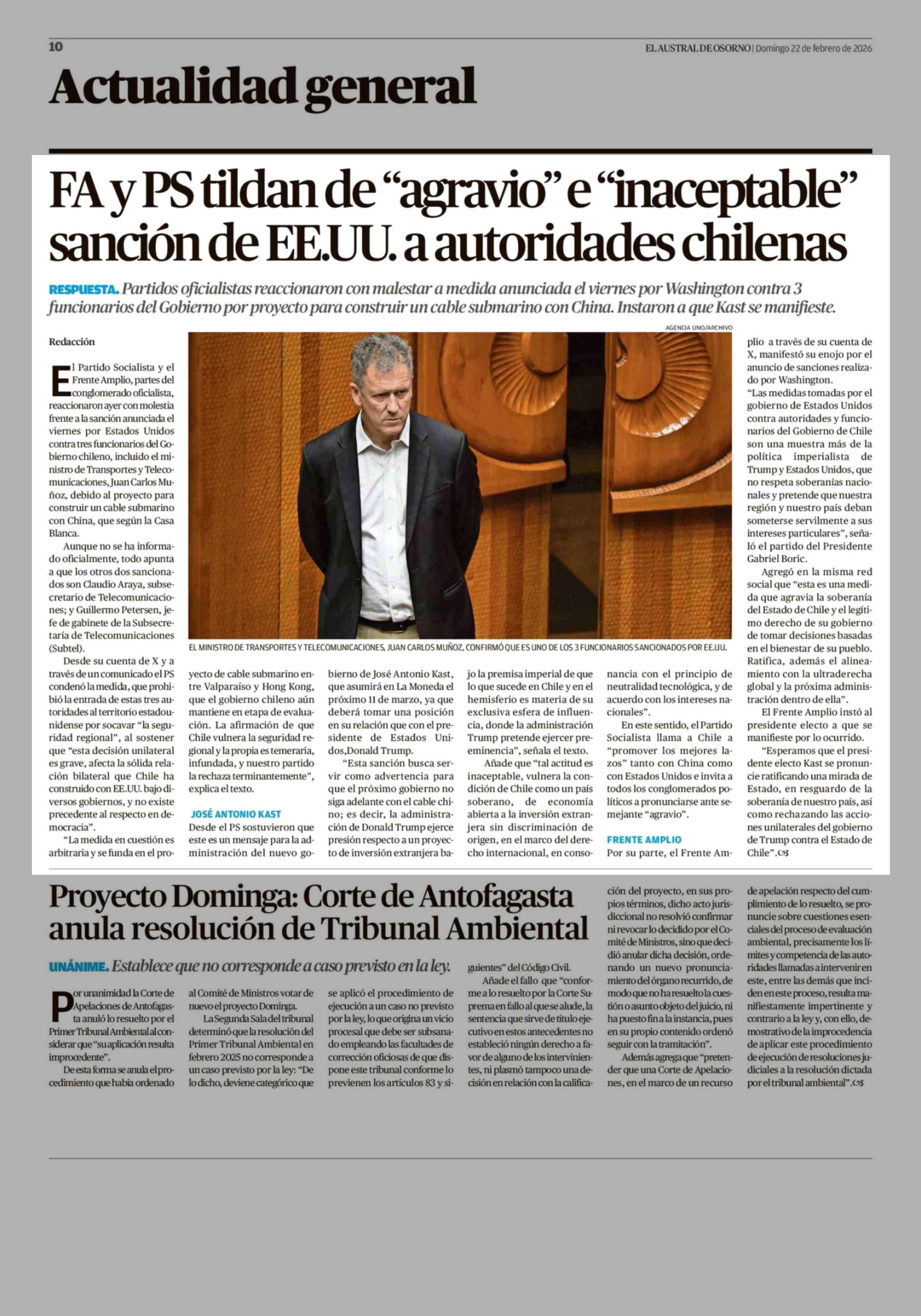 FA y PS tildan de "agravio" e "inaceptable" sanción de EE.UU. a autoridades chilenas 22-02-2026 El Austral de Osorno |