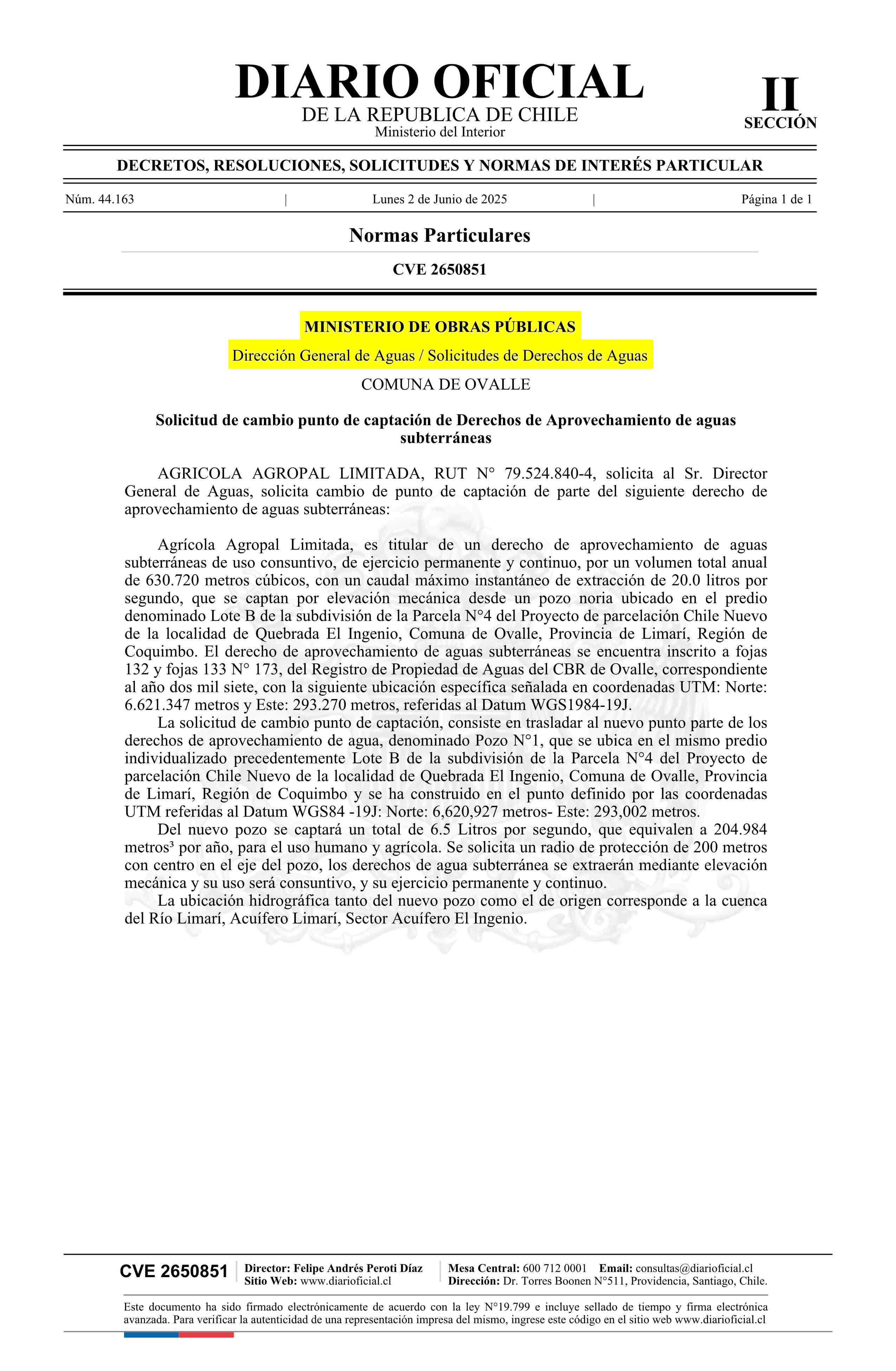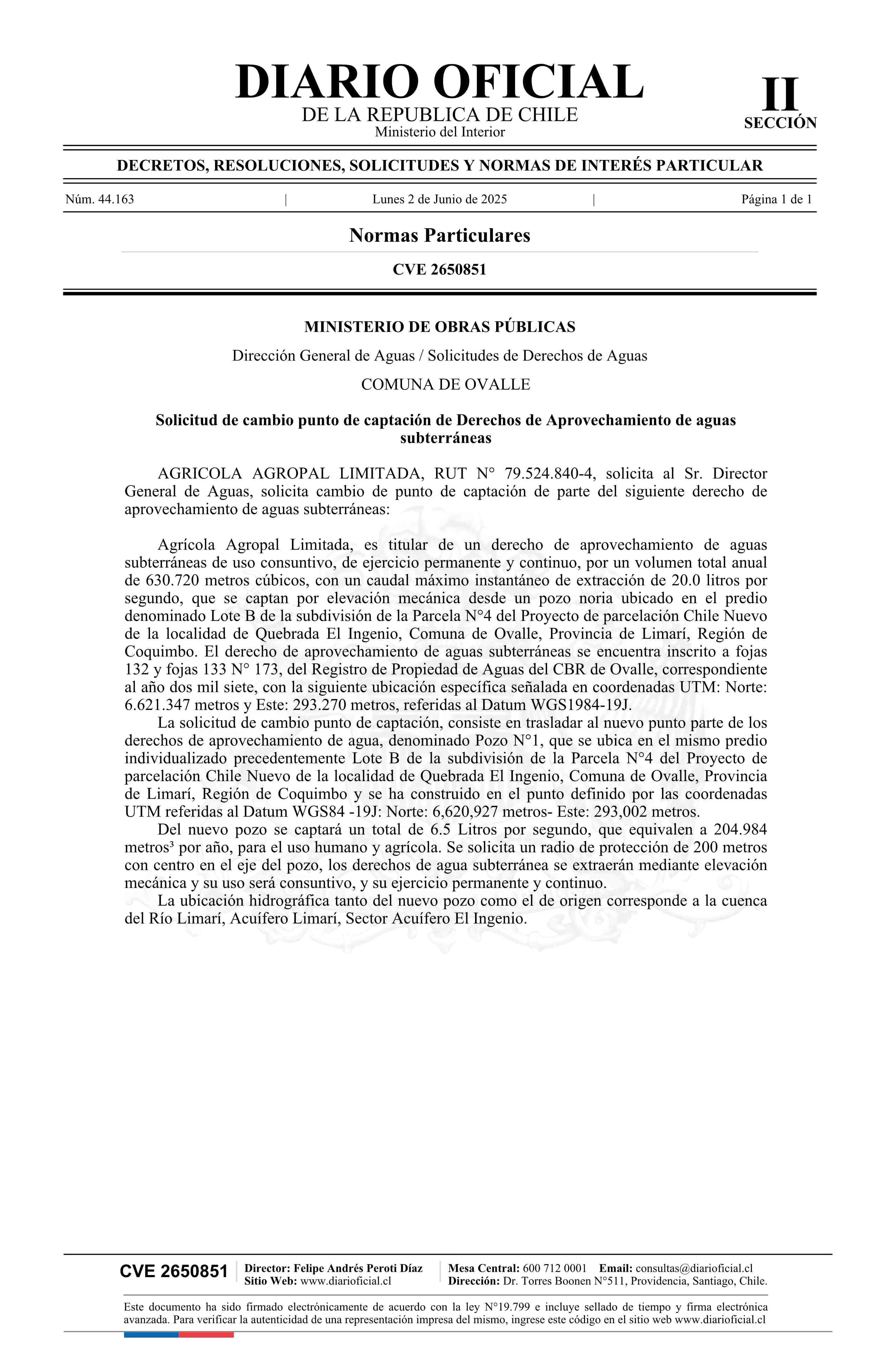 Solicitud Agrícola Agropal Limitada 02-06-2025 Diario Oficial Edición Electrónica |