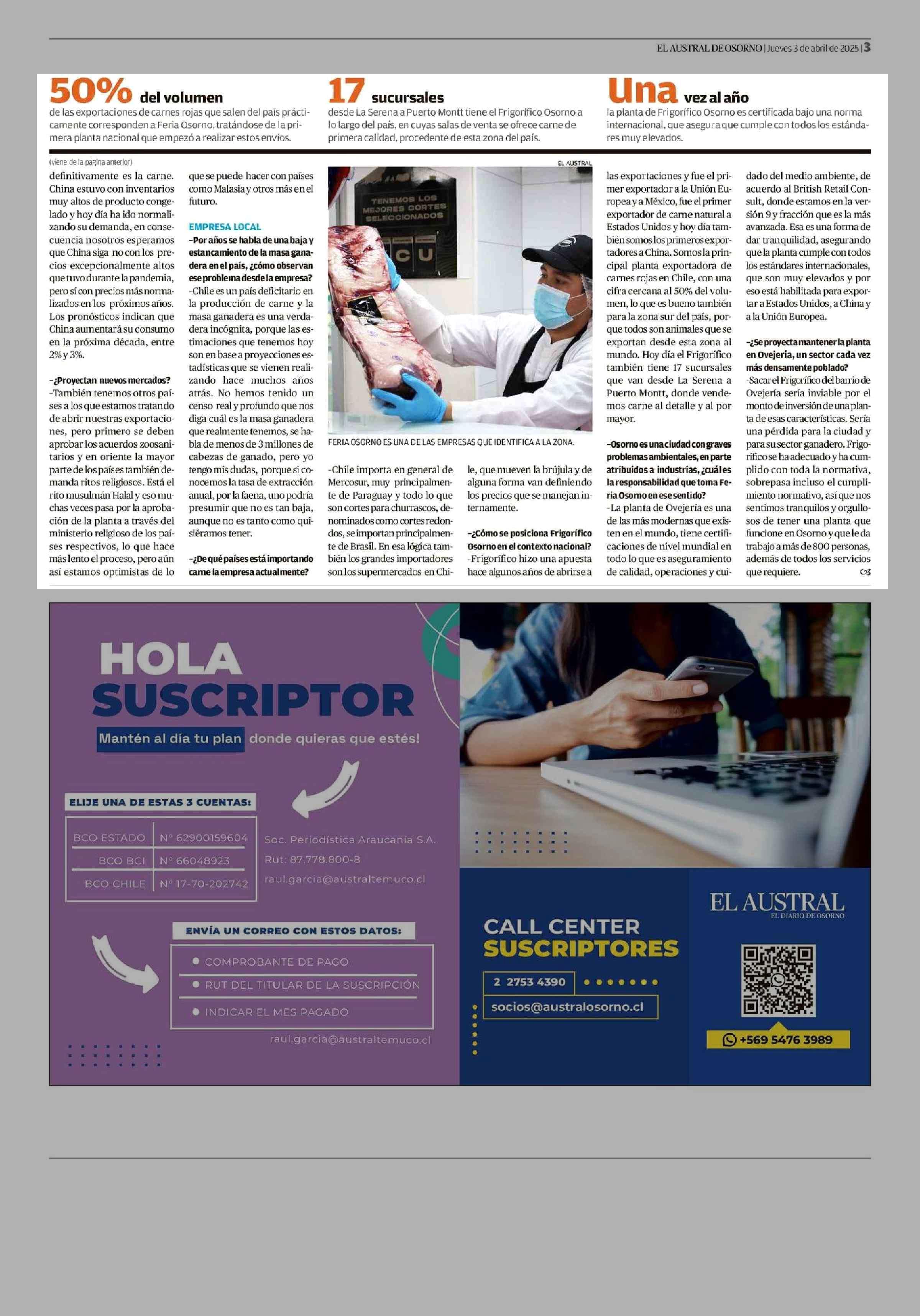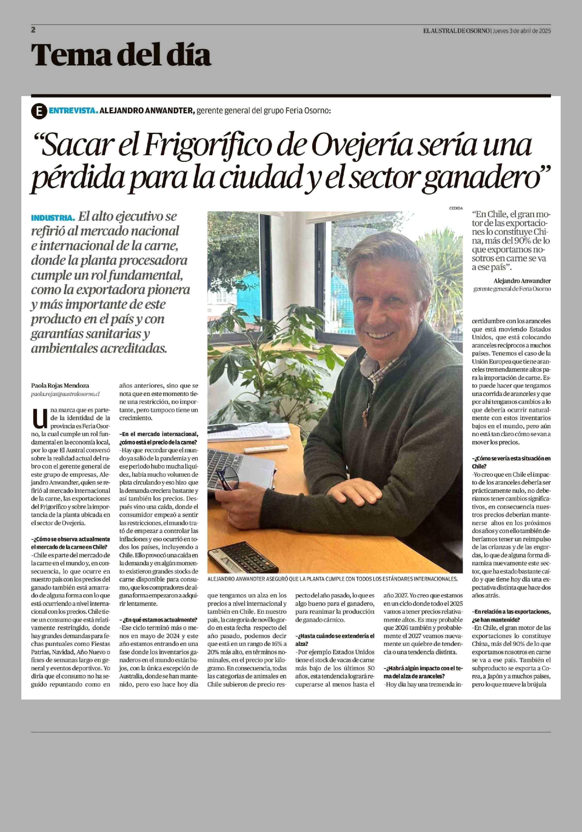 “Sacar el Frigorífico de Ovejería sería una pérdida para la ciudad y el sector ganadero” 03-04-2025 El Austral de Osorno |