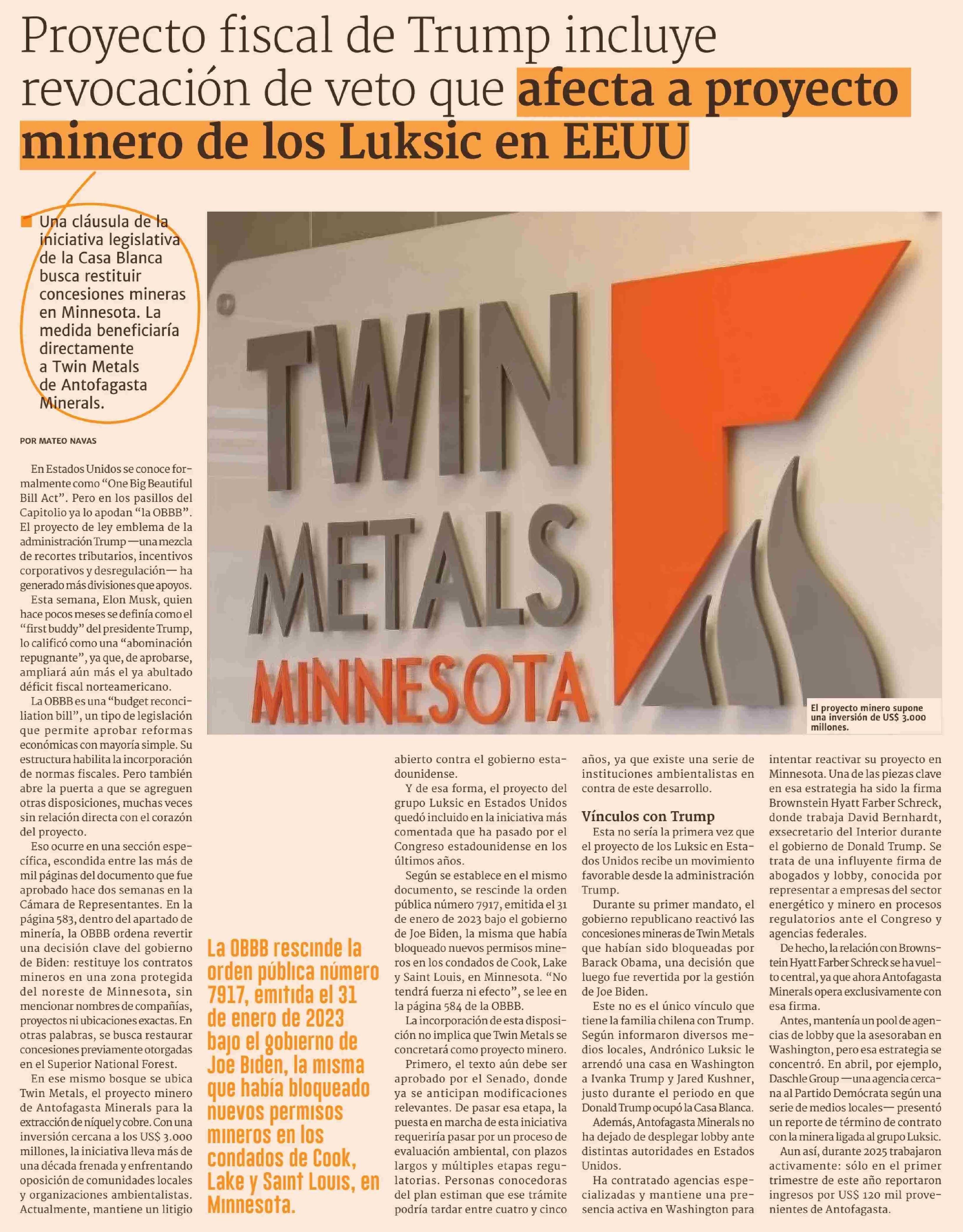 Proyecto fiscal de Trump incluye revocación de veto que afecta a proyecto minero de los Luksic en EEUU 06-06-2025 Diario Financiero |