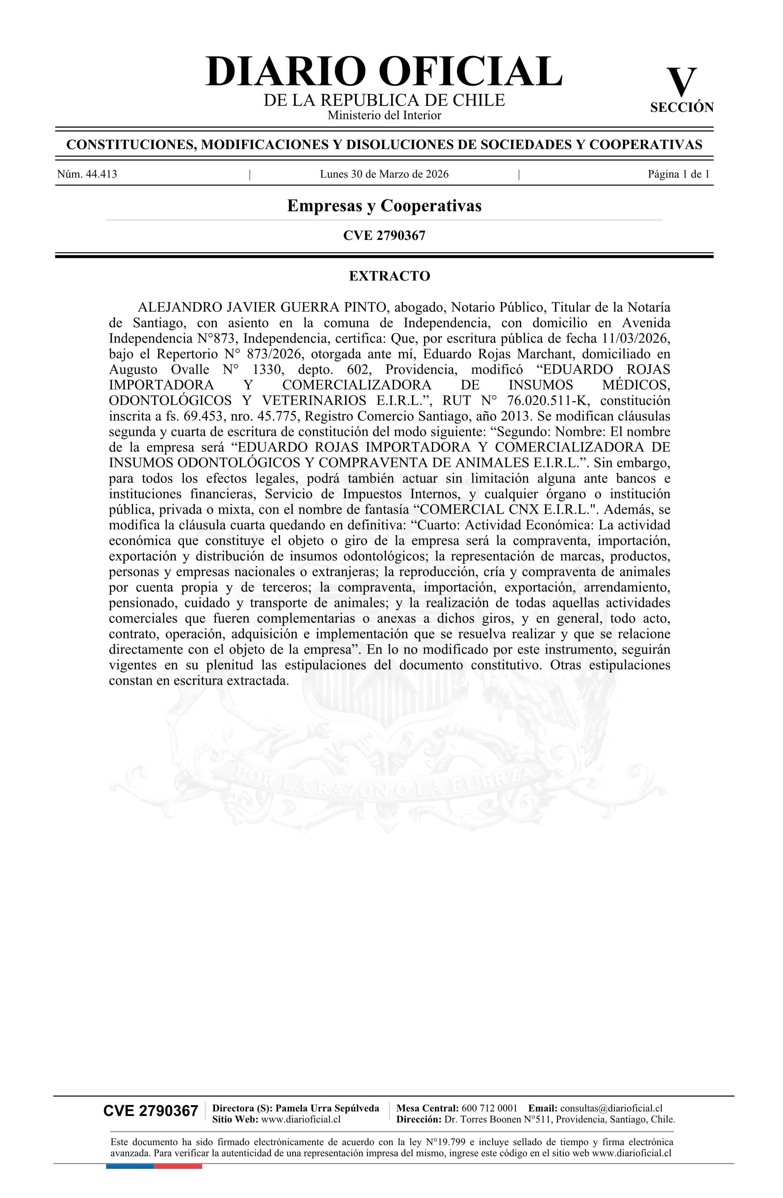EDUARDO ROJAS IMPORTADORA Y COMERCIALIZADORA DE INSUMOS MÉDICOS, ODONTOLÓGICOS Y VETERINARIOS E.I.R.L. 76.020.515-K* 30-03-2026 Diario Oficial Edición Electrónica |