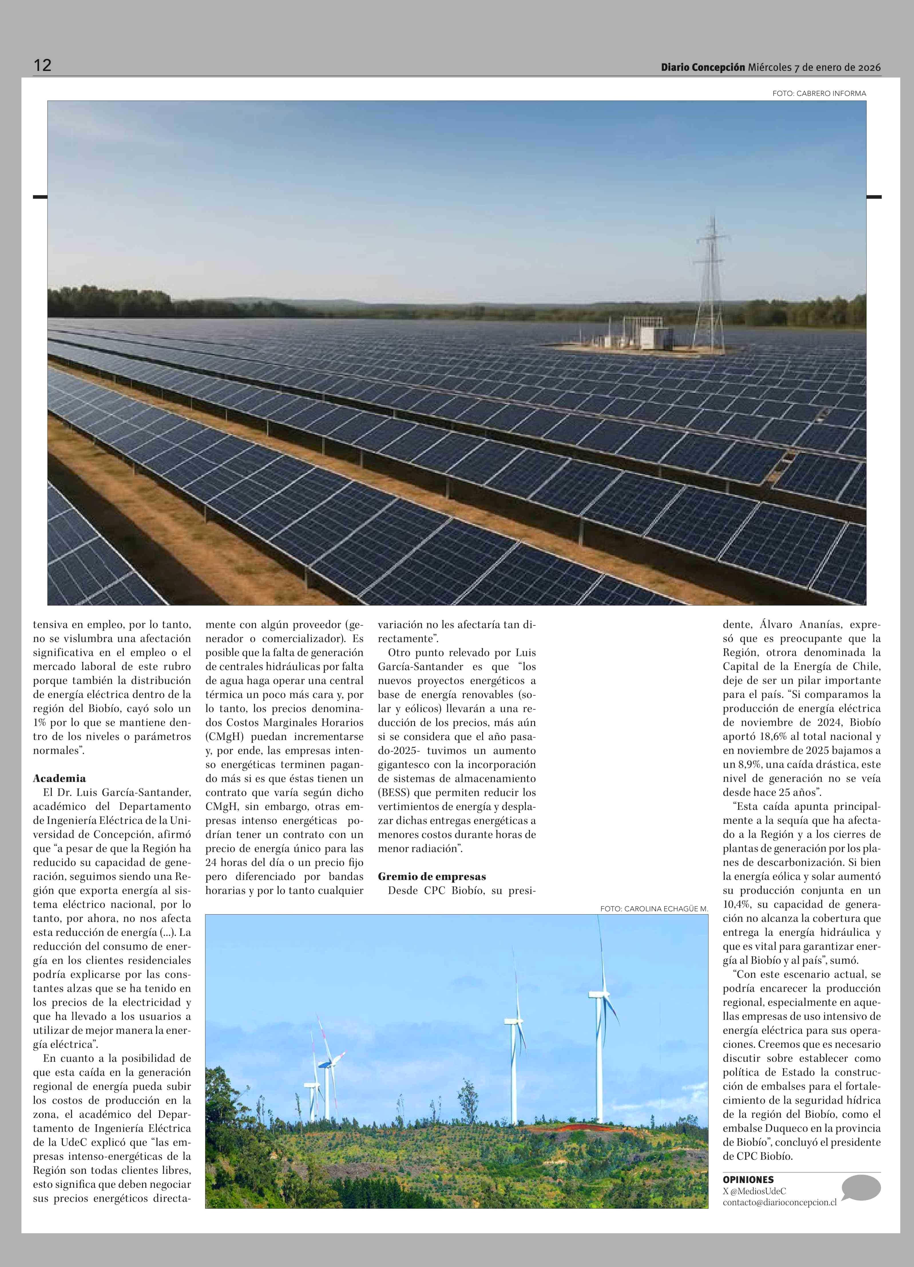 Biobío: Gobierno proyecta mayor equilibrio en generación eléctrica con más tecnología solar y eólica 07-01-2026 Diario Concepción |