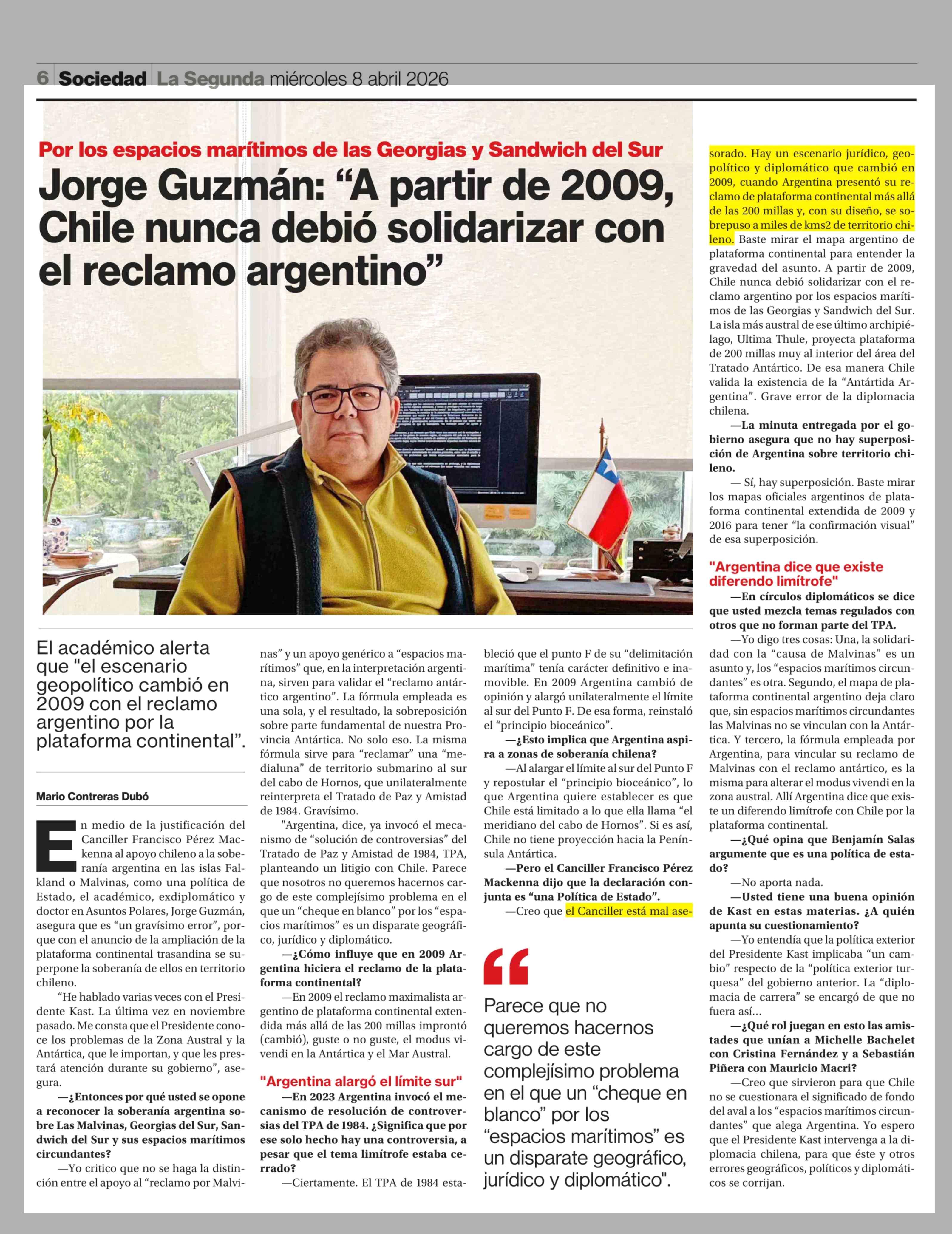 Jorge Guzmán: "A partir de 2009, Chile nunca debió solidarizar con el reclamo argentino" 08-04-2026 La Segunda |