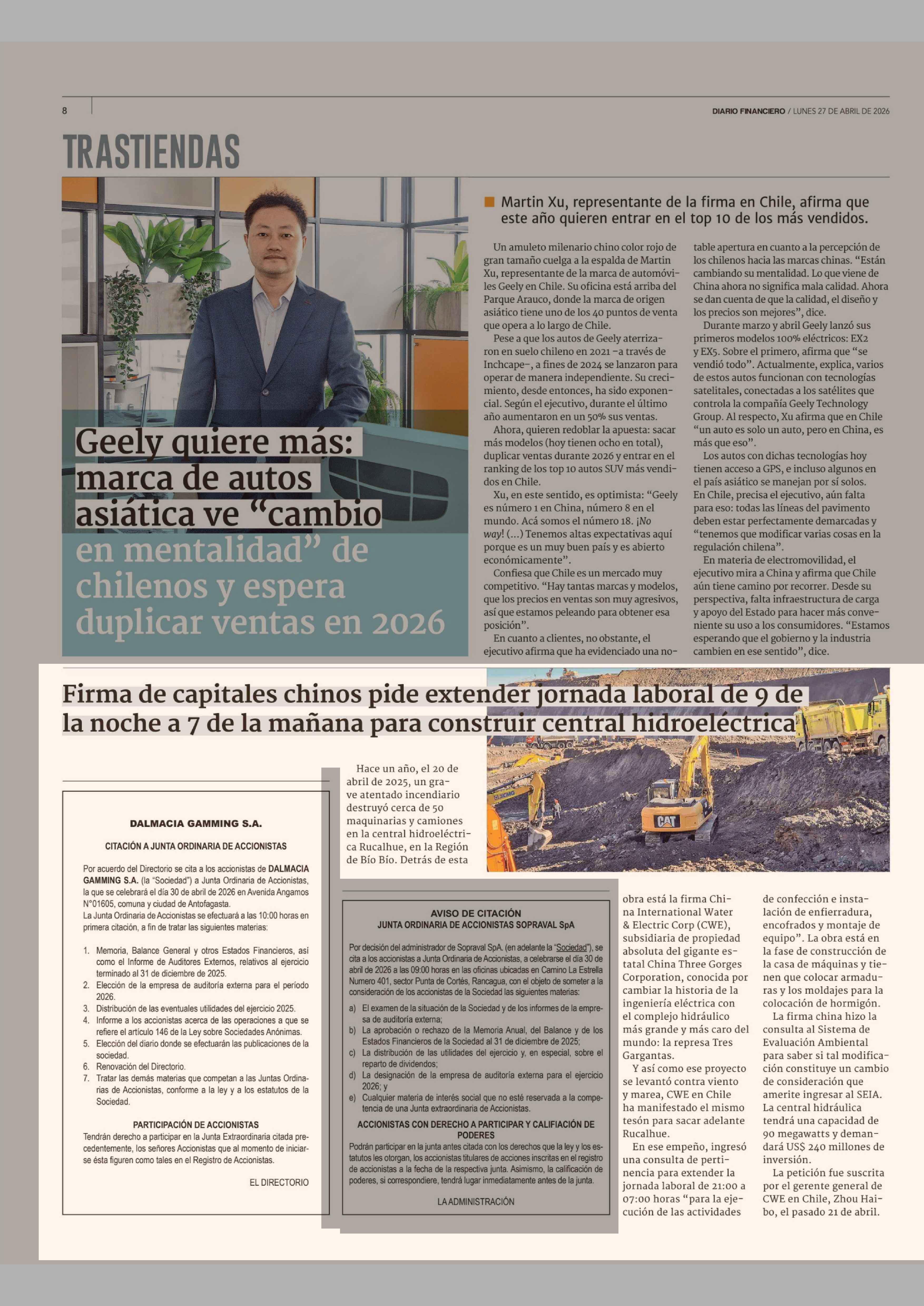 Firma de capitales chinos pide extender jornada laboral de 9 de la noche a 7 de la mañana para construir central hidroeléctrica 27-04-2026 Diario Financiero |