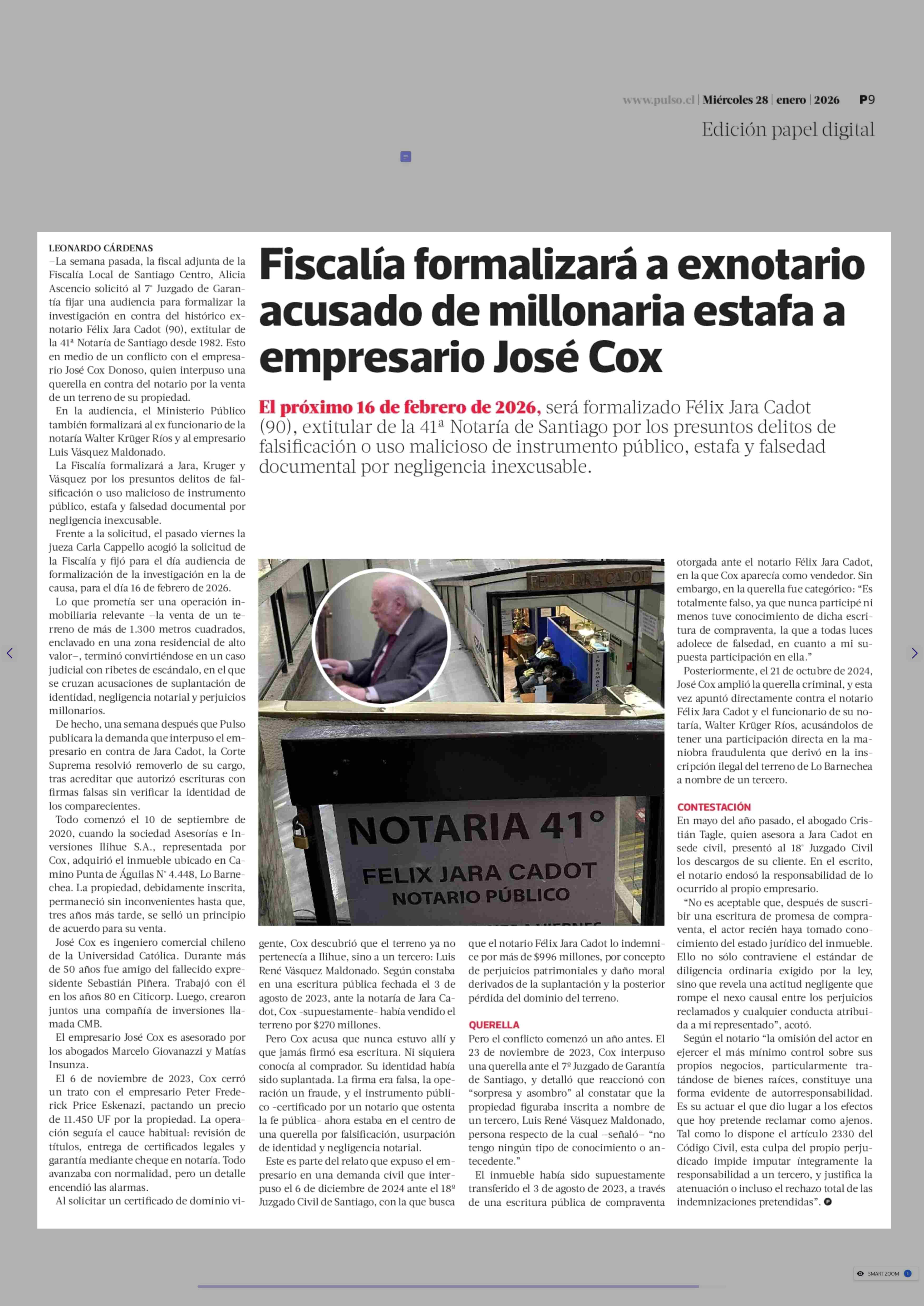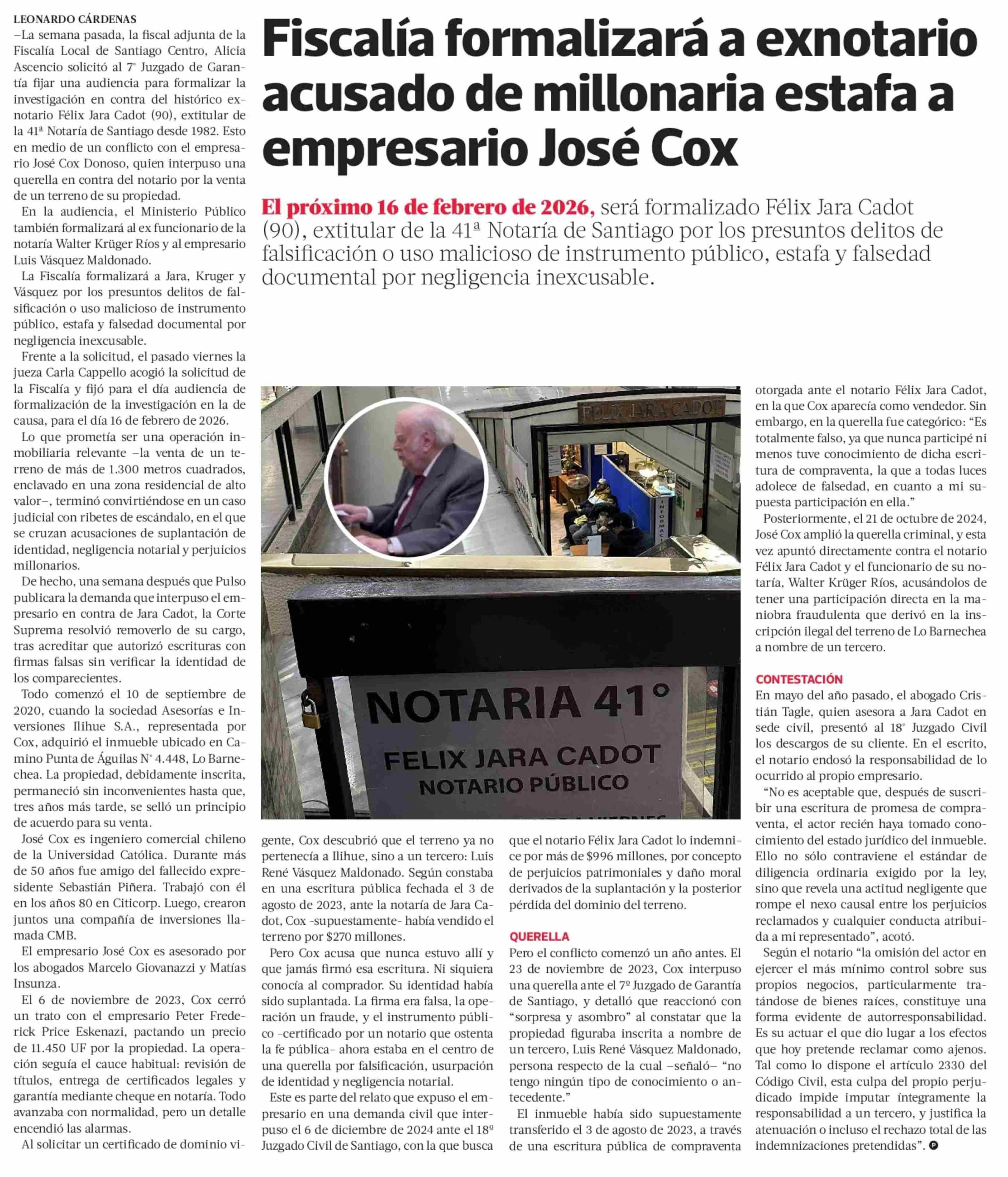 Fiscalía formalizará a exnotario acusado de millonaria estafa a empresario José Cox 28-01-2026 La Tercera |